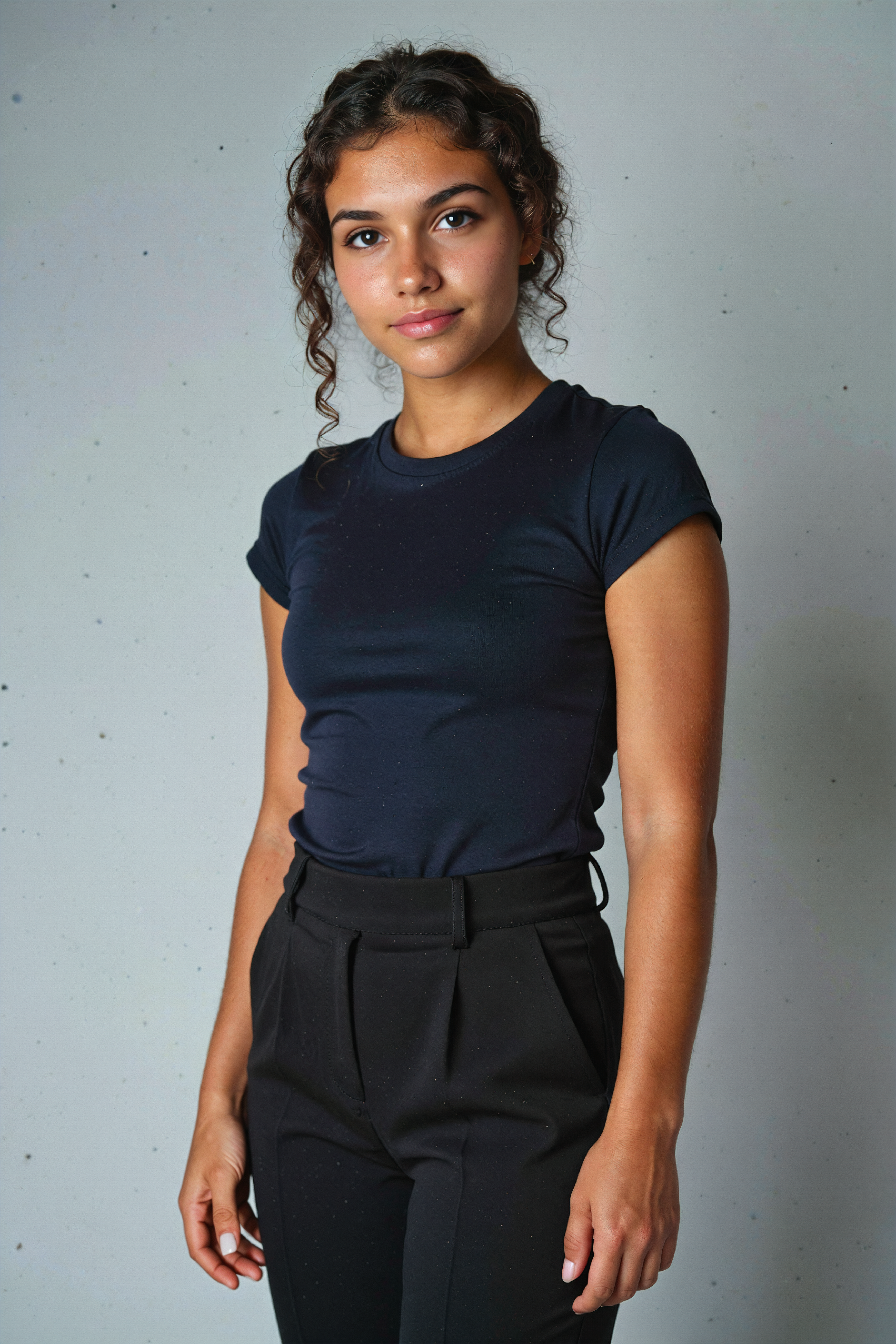 身高24岁的女性,深色古铜肌肤带温暖底色,浓密卷曲的深棕色长发扎成低马尾,几缕发丝散落,腰身纤细,身材娇小,胸部丰满,腹肌紧致,姿态优雅放松,棕色眼睛