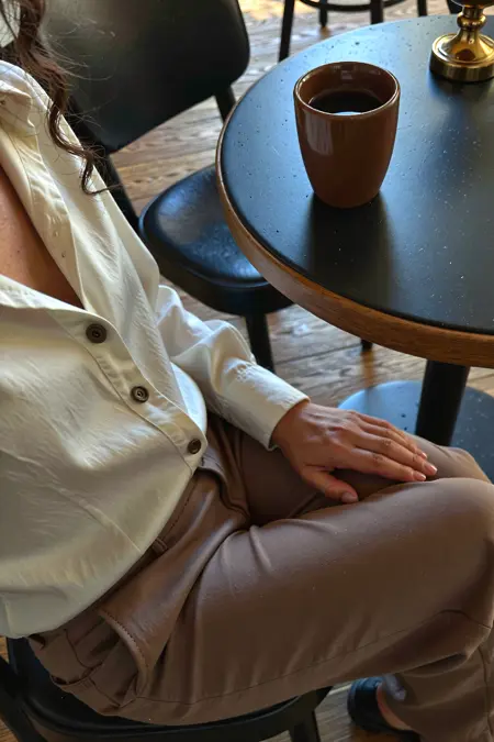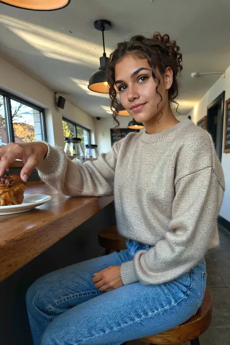Woman041,一张在温馨咖啡馆内拍摄的业余照片,晨光透过窗户洒入,她正啜饮拿铁,身穿宽松休闲上衣和牛仔裤,柔和温暖的光线,自然放松的氛围,写实摄影风格。