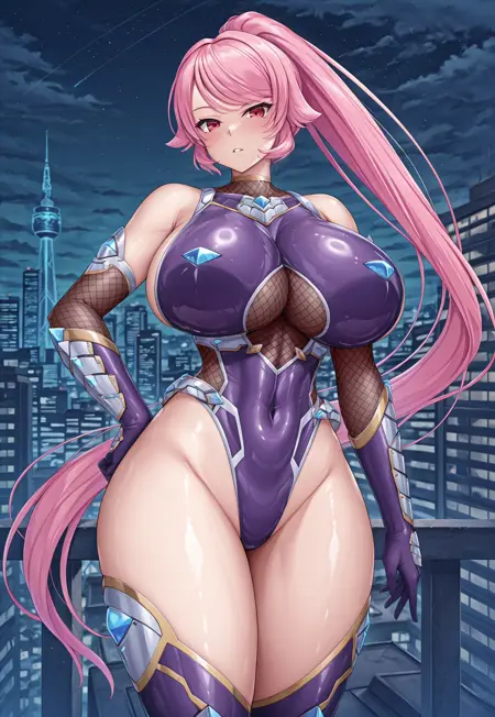 1番目の衣装: タイマニンスーツ、ぴったりフィット、不可能なボディスーツ、アーマー、肩出し、ハイレグレオタード、フィッシュネッツ、肘まで手袋、紫色の手袋、バンブレイス、装甲付き脚部
