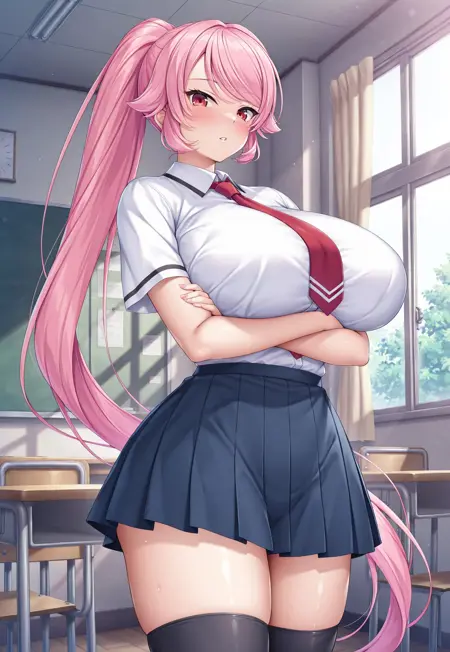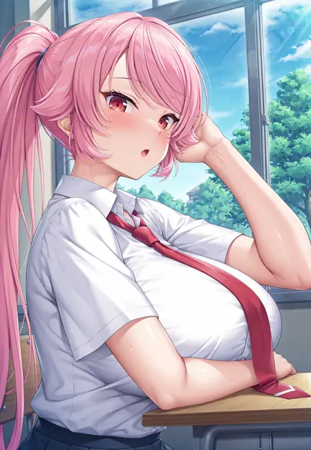 タグ: 1girl, つやつや肌, 女性焦点, 曲線美, nagiriin ryou, ピンク髪, 非常に長い髪, 高いポニーテール, なびく前髪, 角, 赤い目, tsurime, V字眉, 巨乳