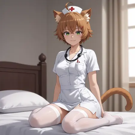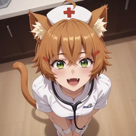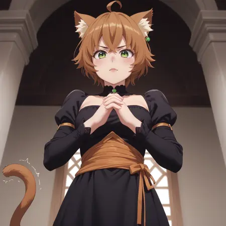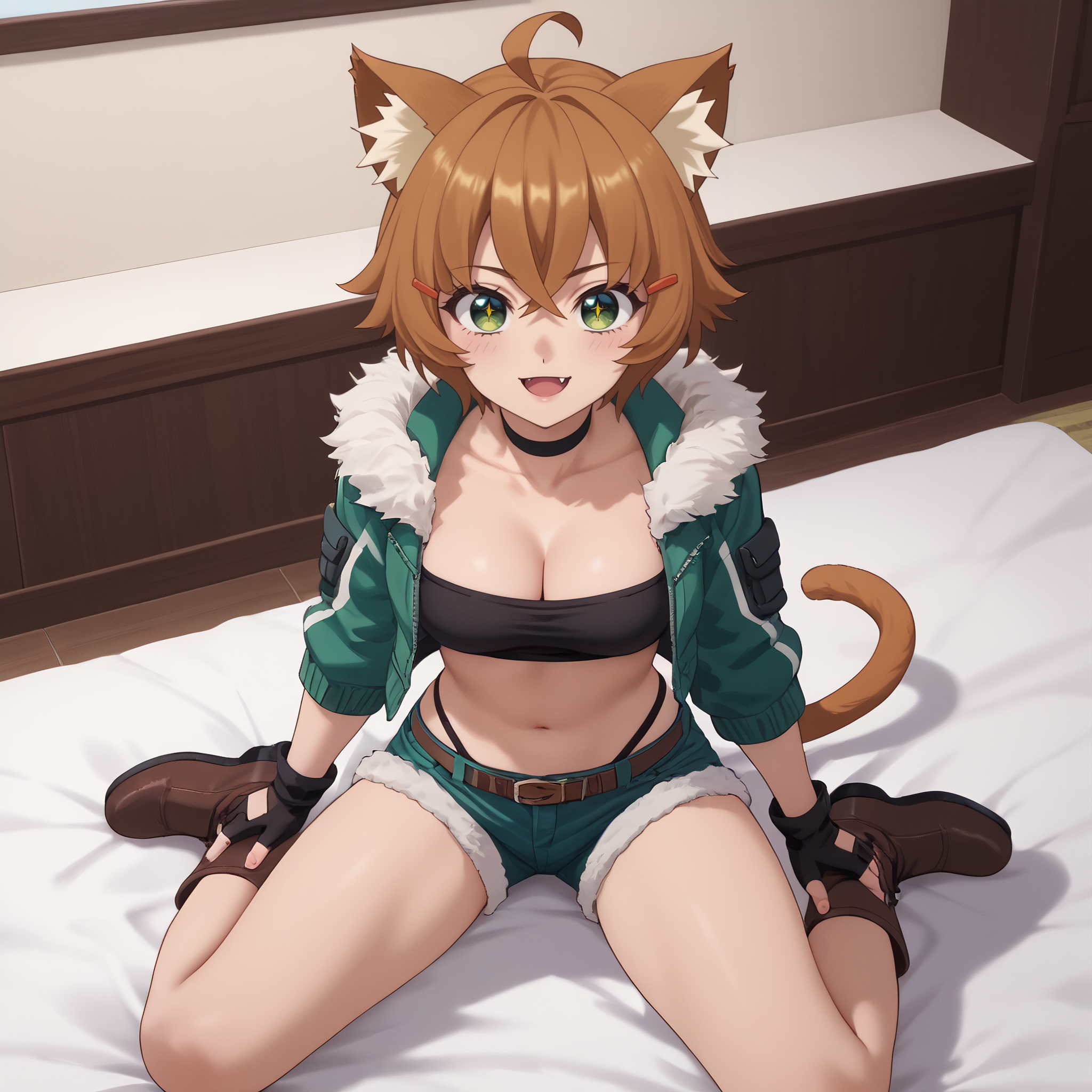 ANene,短发,绿眼,眉毛透过头发可见,动物耳朵,棕发,刘海,虎牙,头发遮住眼睛,天线辫,猫耳,动物耳朵绒毛,尾巴,猫尾,