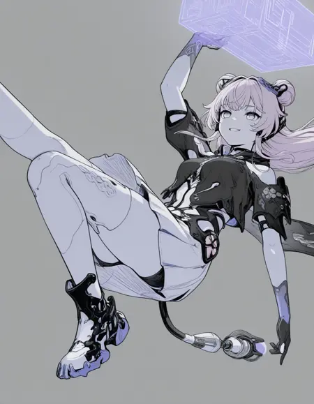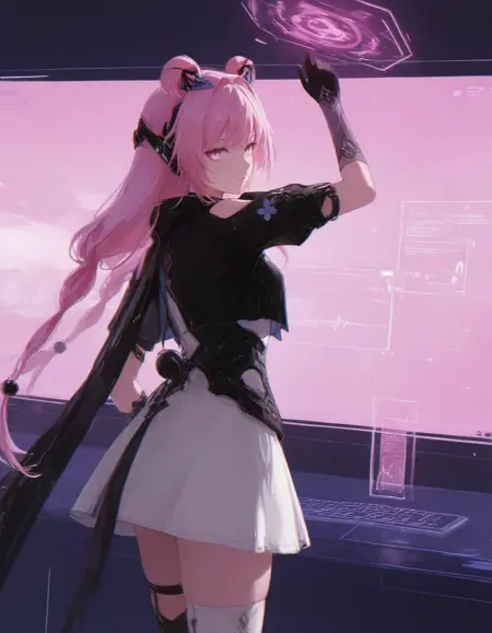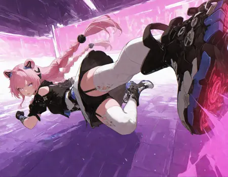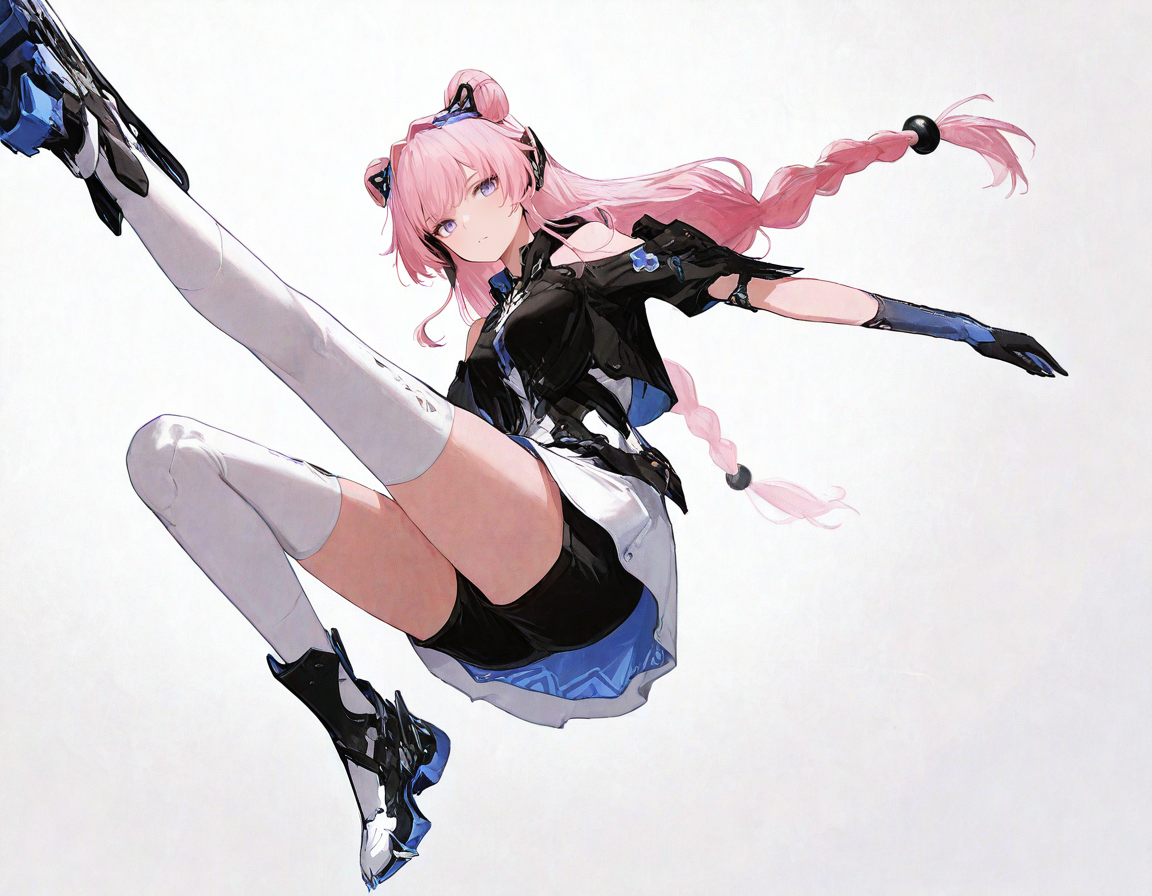 mai_pgr_teddyhy,long_hair,double_bun,twintails,pink_hair,hair_between_eyes,purple_eyes,headgear,shoulder_cutout,black_jacket,white_dress,black_gloves,asymmetrical_legwear,black_footwear,garter_straps,boots