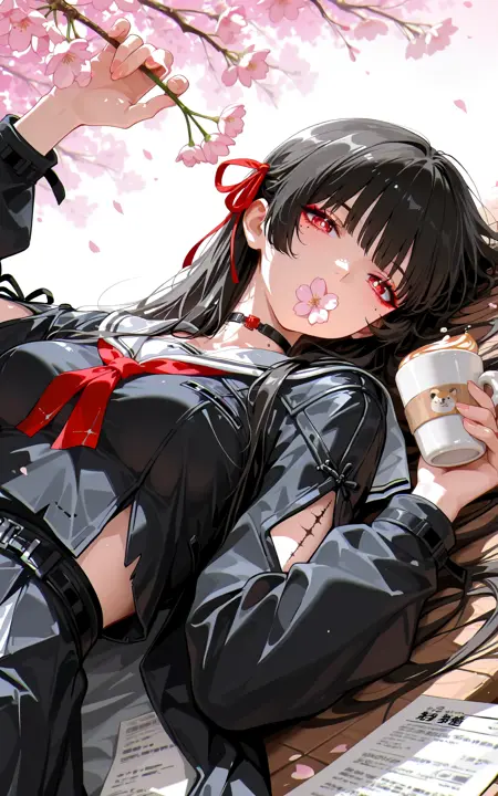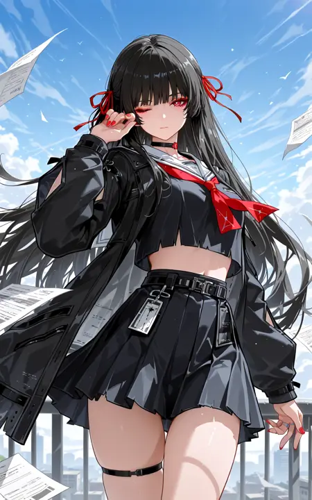 上半身:chisa \(wuthering waves\), official clothing, 1girl, solo, long hair, black hair, bangs, blunt bangs, red eyes, hair ribbon, red ribbon,