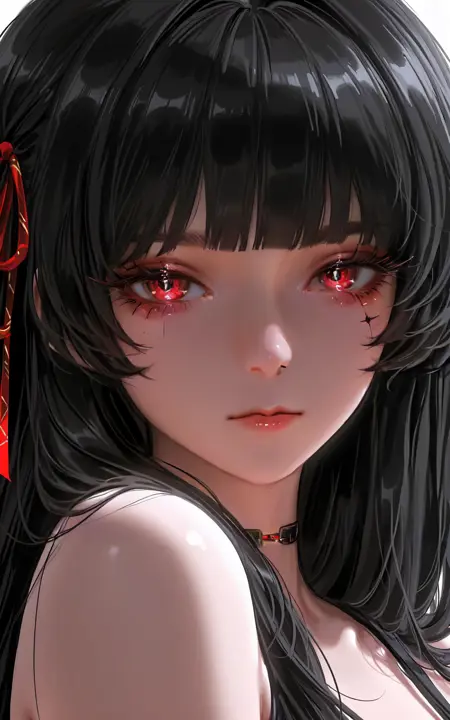 换衣头:chisa \(wuthering waves\), alternate costume, 1girl, solo, long hair, black hair, bangs, blunt bangs, red eyes, hair ribbon, red ribbon,