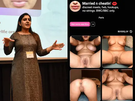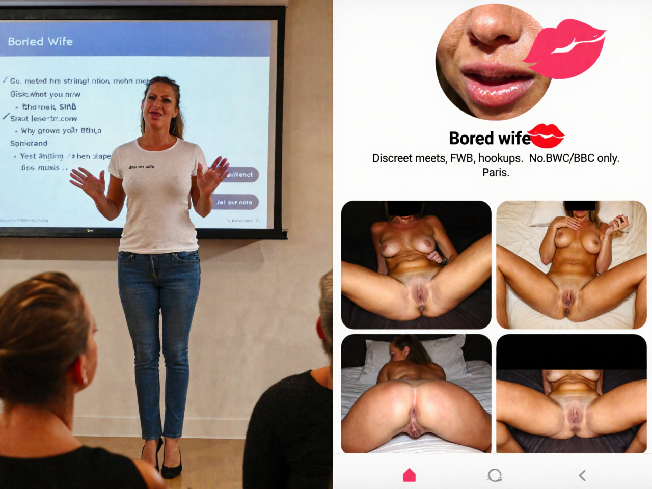 오른쪽은 불법적인 데이팅 앱의 스크린샷으로, 같은 여성의 침실에서 어두운 배경을 배경으로 한 얼굴 없이 신체만 노출된 여러 셀피 스타일 사진과 채팅 버블이 표시되어 있으며, 그녀는 벌거벗은 상태이고 얼굴은 잘려나가 있으며, 가슴, 음부, 항문을 과시하는 다양한 성적인 자세를 취하고 있습니다. 표정은 긴장하고 수줍으며 피로한 (smile:0.5). 화면 상단에는 고각 셀피로 촬영된 코, 입술, 가슴 사이의 공간만 보이는 원형 사진이 있으며, 이름은 "{혼자인 섹시한 여자|지루한 아내|성욕에 시달리는 외로운 여자|기혼 중 도둑질|사나운 여자|나쁜 소녀|섹시한 작은 여자}"이며, 키스하는 입술 이모티콘이 표시되어 있고, 옆에는 프로필 문구로 "비밀스러운 만남, 친구 관계, 일시적 관계, 의무 없음. {런던|베이 에어리어|파리|나이로비}. BWC/BBC 전용!" 이 적혀 있습니다.