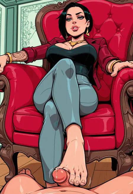 Prompt1: penny burfine, 1girl, black hair, short hair, eyeshadow, green eyes, thick lips, nose piercing, makeup, lipstick, rib tattoo, large breasts, arm tattoo, pubic tattoo, alpha tattoo