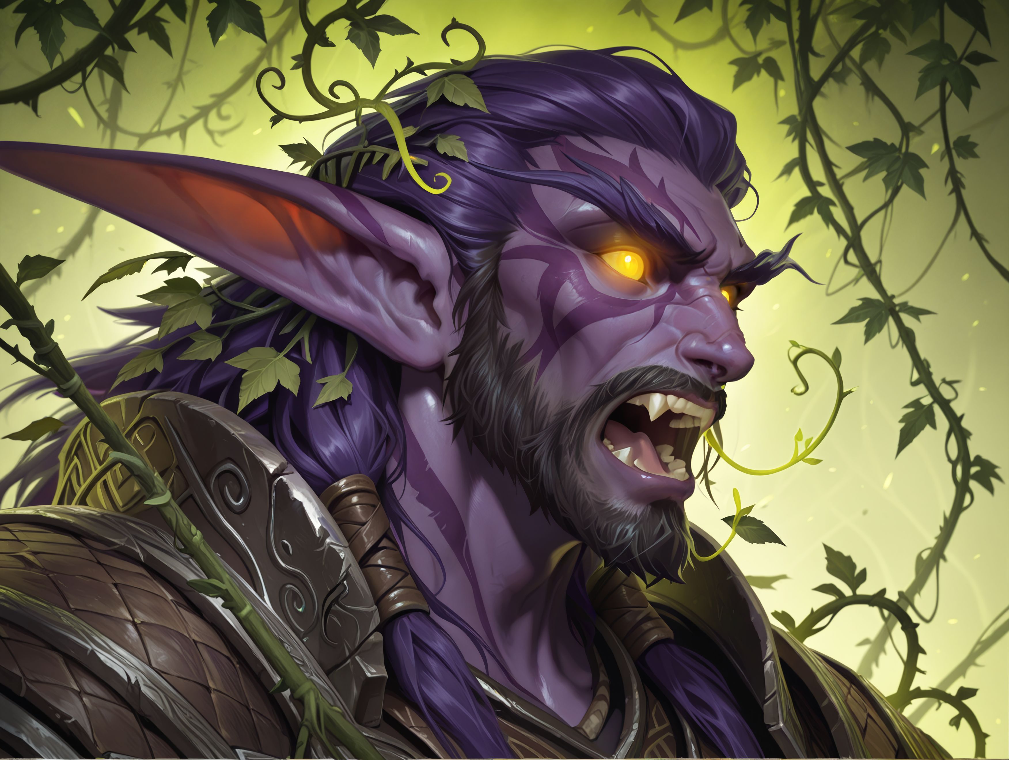 标签:n1ght3lf,肌肉发达,高挑,发光的眼睛,长耳朵,尖耳朵,长眉毛,彩色皮肤,面部毛发,长发,紫色皮肤,身体纹身,面部纹身,