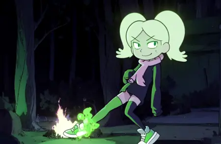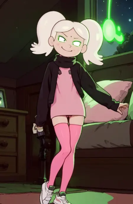 カジュアルな服:マラ、短い髪、観察者を見つめる、カウボーイショット、口を開けた状態、長い袖、ツインテール、黒い目、セーター、全身、金髪、靴、太ももハイズ、歯、黒い靴、黒いセーター、袖が手首より長い、輝く目、上歯のみ、袖が指より長い、浮遊中、屋内、大きめの服、(屋内、寝室;屋外、森、緑の炎、緑の骨火)