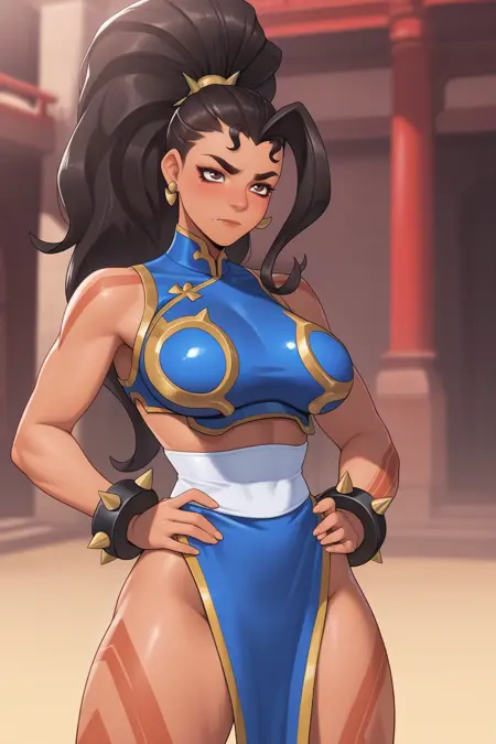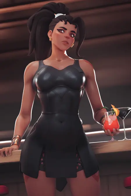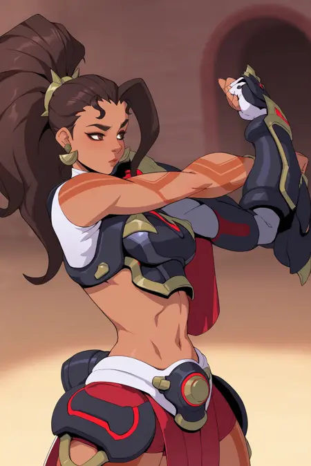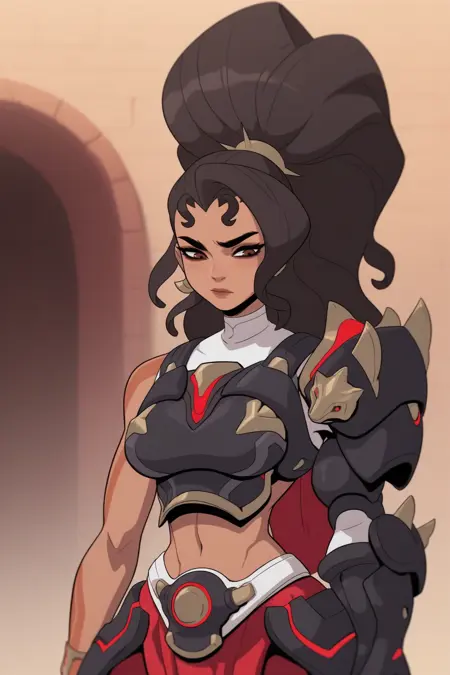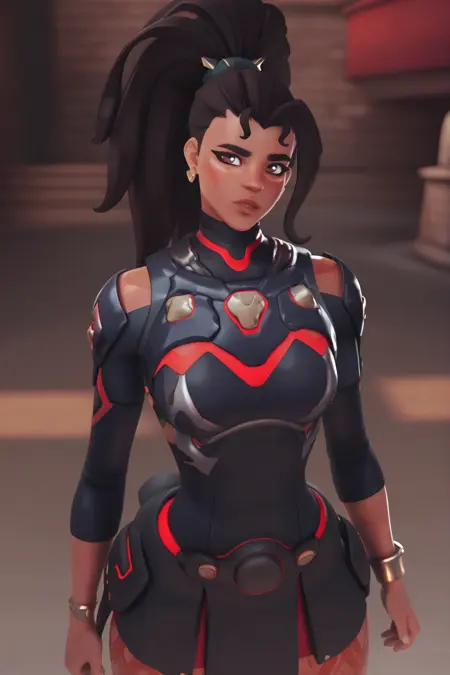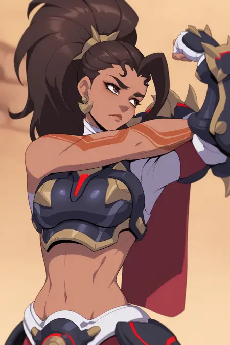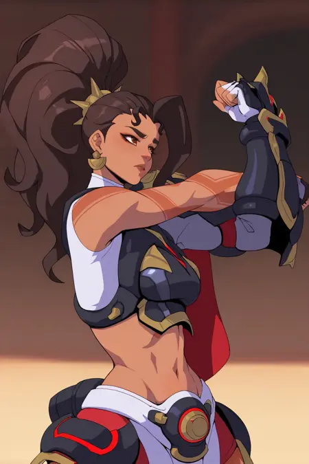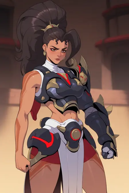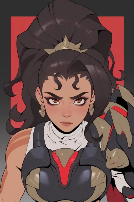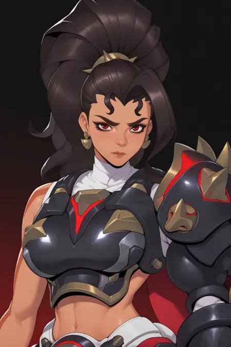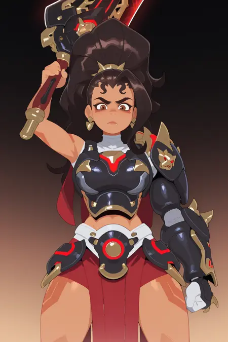 1girl, solo, vendetta \(overwatch\), dark skin, armor, dark-skinned female, weapon, holding, holding weapon, long hair, ponytail, black hair