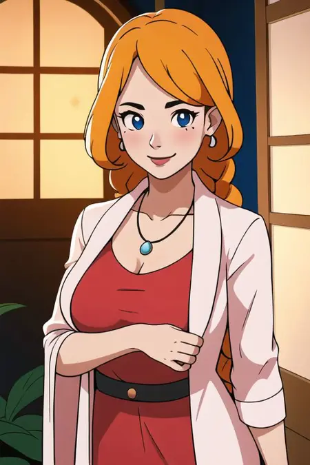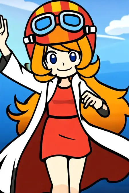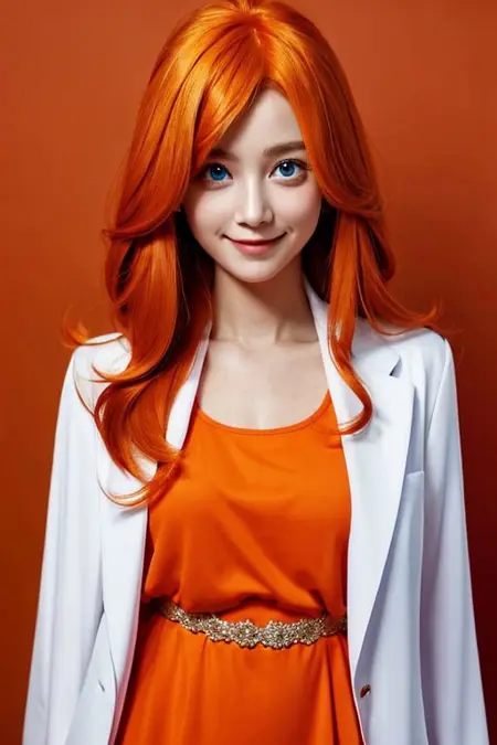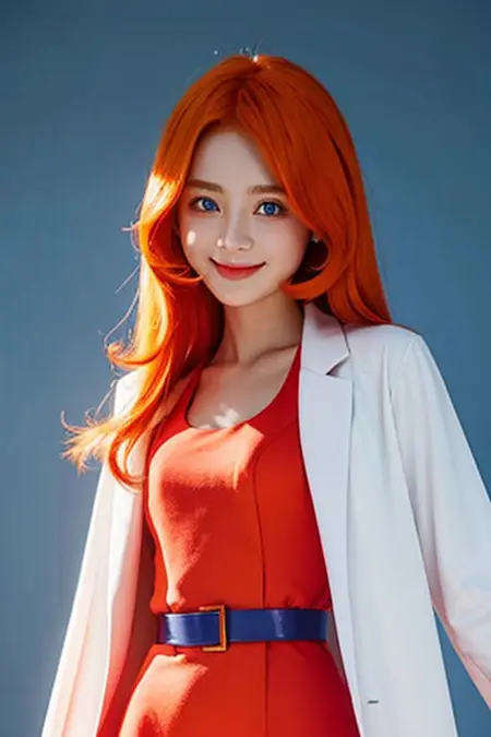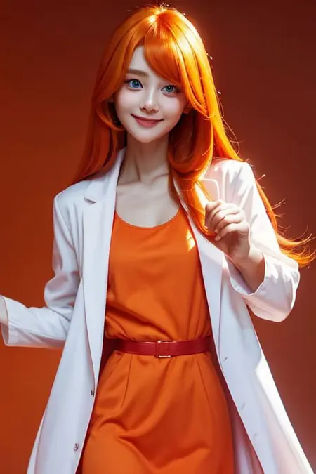 1girl, long hair, blue eyes, solo, orange hair, smile, dress, labcoat, red dress