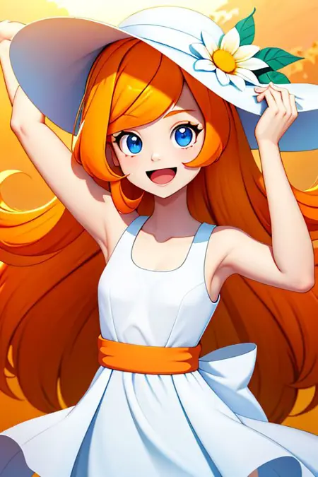 1girl, blue eyes, solo, orange hair, smile, dress, long hair, smile, open mouth, hat, dress, bow, ribbon, upper body, flower, outdoors, sleeveless, white dress, , sleeveless dress, white flower, sun hat, hat flower, sundress