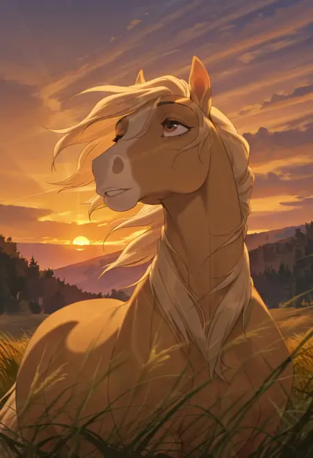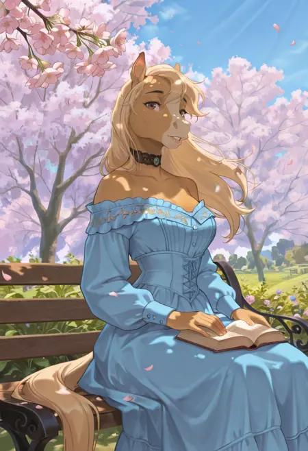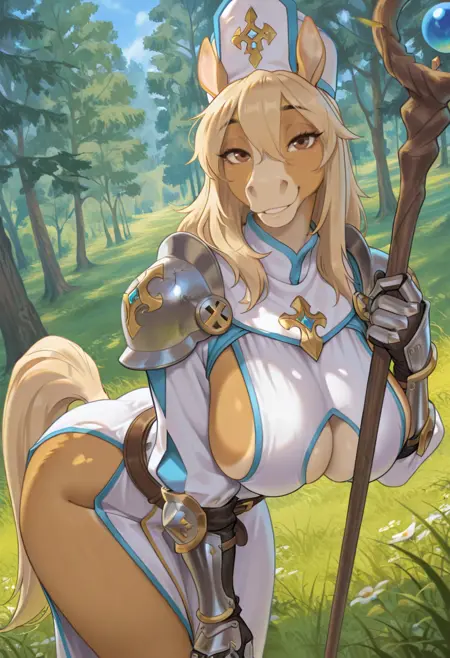 1girl, furry, equine, horse ears, tan fur, white fur, two tone fur, brown eyes, blonde mane, black eyebrows, blonde tail,