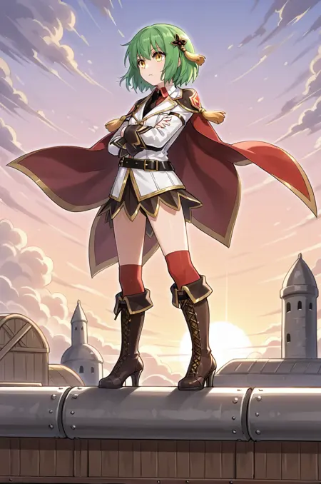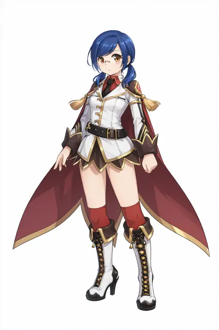 prompt: geneROAl, red cape, black necktie, tassel, long sleeves, white jacket, red collared shirt, black miniskirt, black belt, red legwear, white knee boots, lace-up boots, high heels