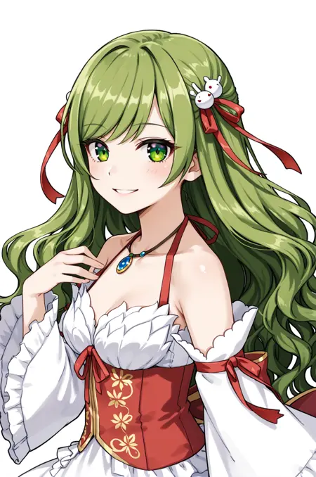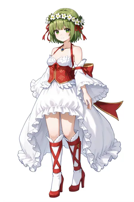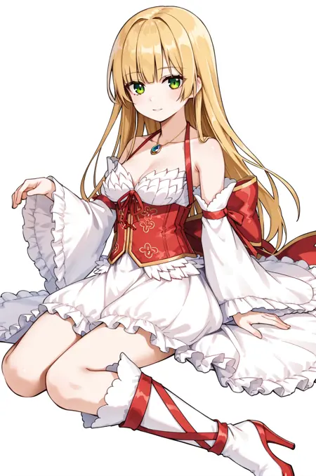 prompt: wandROAl, detached sleeves, necklace, halterneck, bare shoulders, wide sleeves, long sleeves, white frilled dress, layered dress, frills, red ribbon, corset, frilled skirt, high heels, knee boots,