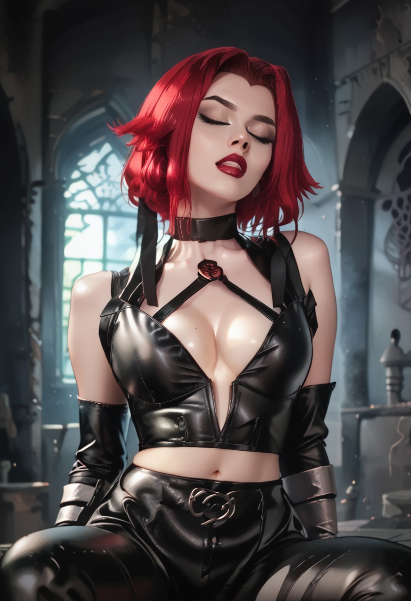 BL-rayne, realistic, bloodrayne, 1girl, solo, red hair, pale skin, cleavage, short hair, make up