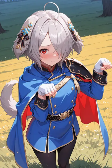 彼女の典型的な外見には、「髪飾り、青いマント、両面マント、片方の肩当て、青いジャケット、青いユニフォーム、二列ボタン、黒いベルト、ボタン、長袖、白い手袋、指なし手袋、黒いパンスト、白いブーツ」を追加してください。