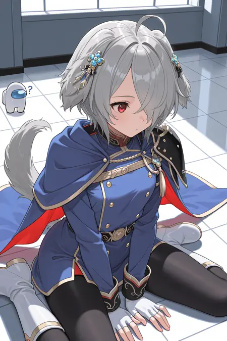 トリガー語は「fekrt」で、「灰色の髪、短髪、あほ毛、犬の耳、片方の目に髪がかかる、赤い目、犬の尾」が必要です。