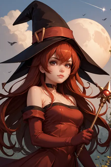 プロンプト: cierra_(riviera), long_hair, dress, choker, gloves, witch_hat, red_eyes