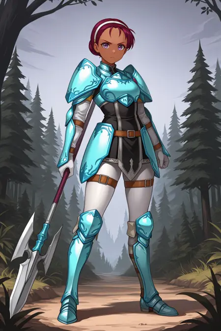 Add "white hairband, blue armor, shoulder armor, black tunic, white gloves, blue gauntlets, white pantyhose, armored boots" for her typical look.