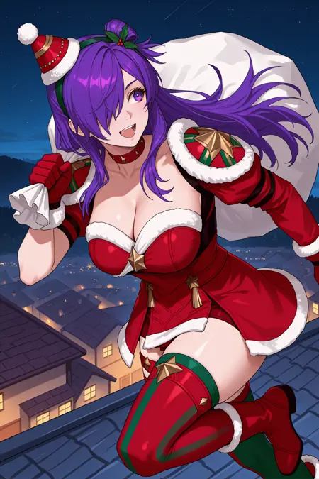 겨울 셰즈를 원할 경우 "wntsh, 보라색 머리카락, 한 개의 머리 땋기, 긴 머리, 한쪽 눈 위의 머리카락, 보라색 눈, 산타 모자, 녹색 머리띠, 빨간 목걸이, 빨간 어깨 패드, 빨간 드레스, 짧은 드레스, 한쪽 소매, 가슴 노출, 털 장식, 털 장식된 장갑, 빨간 허벅지 스트랩, 녹색 허벅지 양말, 빨간 허벅지 양말, 어울리지 않는 다리 착용, 빨간 부츠"를 추가하세요.