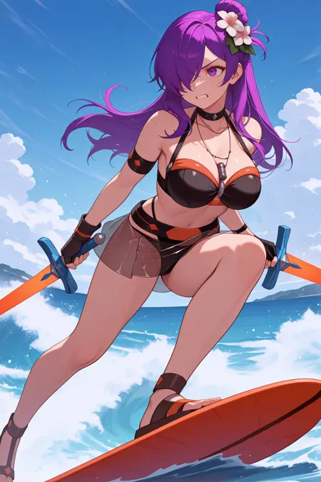 여름 셰즈를 원할 경우 "sumsh, 보라색 머리카락, 한 개의 머리 땋기, 긴 머리, 한쪽 눈 위의 머리카락, 보라색 눈, 머리 꽃, 검은 목걸이, 목걸이, 검은 비키니, 주황색 비키니, 이색 비키니, 검은 팔찌, 검은 벨트, 투명한 치마, 샌들, 검은 장갑, 한 손가락 없는 장갑"을 추가하세요.