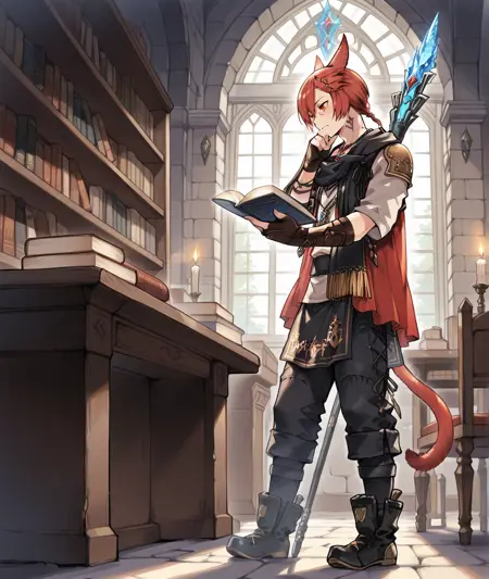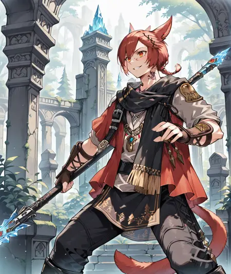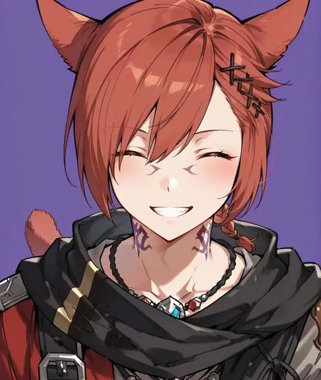 Character tags: GrahaBase, miqo'te, cat ears, cat tail, red eyes, slit pupils, red hair,short hair, low ponytail, braided ponytail, short ponytail, single braid, x hair ornament, brown hair ornament, facial mark, neck tattoo, necklace, pendant, jewelry, black scarf, fringe trim, red jacket, short sleeves, grey shirt, black long inner tunic, brown armguard, brown fingerless gloves, black belt, belt buckle, black pants, black boots,