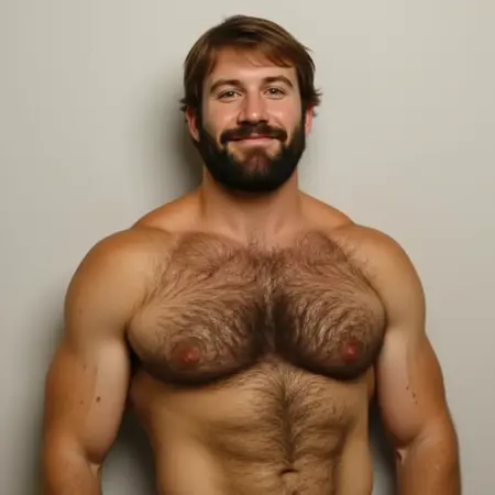 克里斯托夫身材宽厚健壮,肩膀、胸部和手臂肌肉线条分明,充满原始的力量感。他的皮肤呈浅棕色,胸部覆盖着浓密的深棕色体毛,向下延伸至腹部,呈现出粗犷阳刚的气质。他的胡须浓密深色,修剪整齐,衬托出方正的下颌线条。他的双腿与上半身一样有力,大腿和小腿肌肉厚实而雕塑感十足。总体而言,他的体型融合了大力士的壮硕与运动员的清晰线条。他的面部轮廓坚毅,方正的下颌搭配锐利的蓝色双眼。他金黄色的头发浓密凌乱,长度略过耳际,而修剪整齐的胡须勾勒出面部轮廓,增添了一抹粗犷阳刚的气息。
