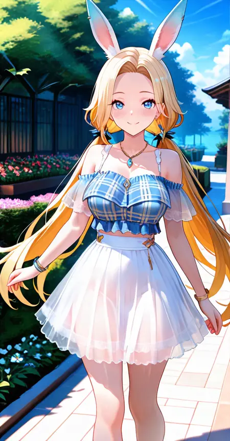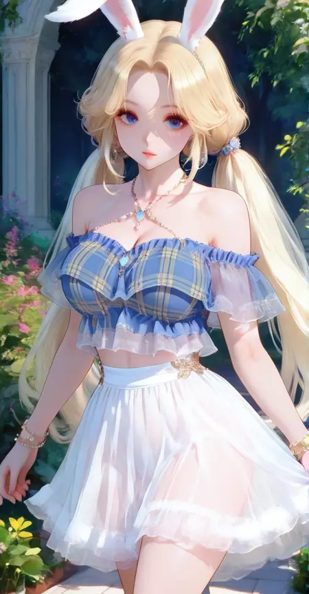 plaid shirt, off-shoudler skirt, rabbit ears, xg1, bare shoulders, bracelet, necklace, see-through, jewelry