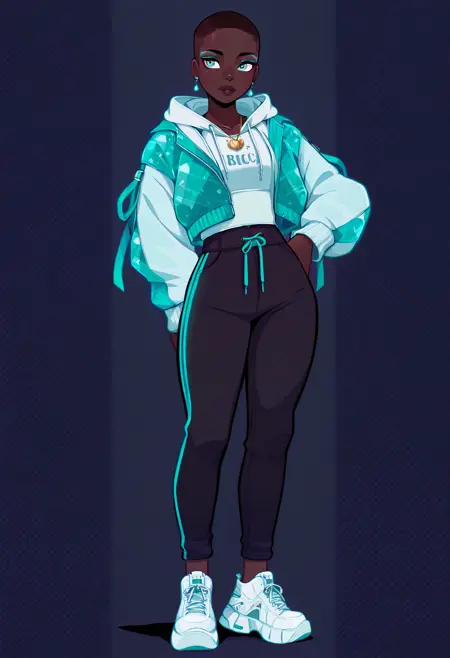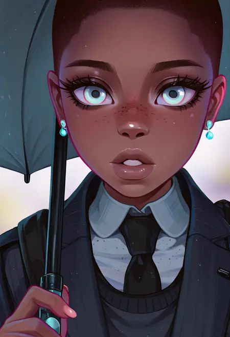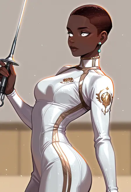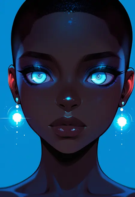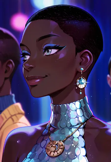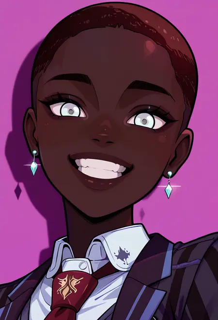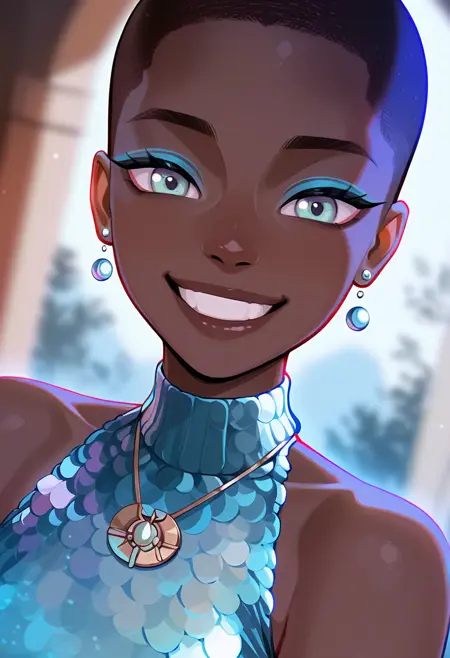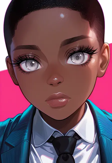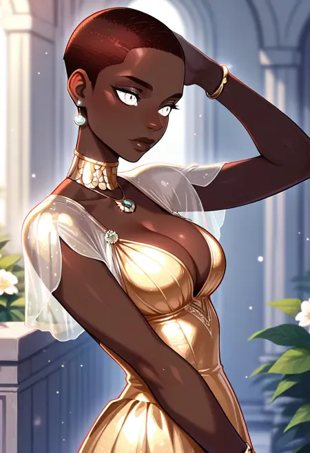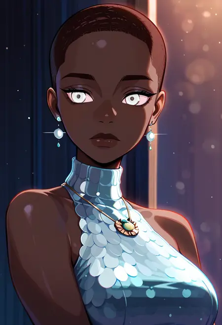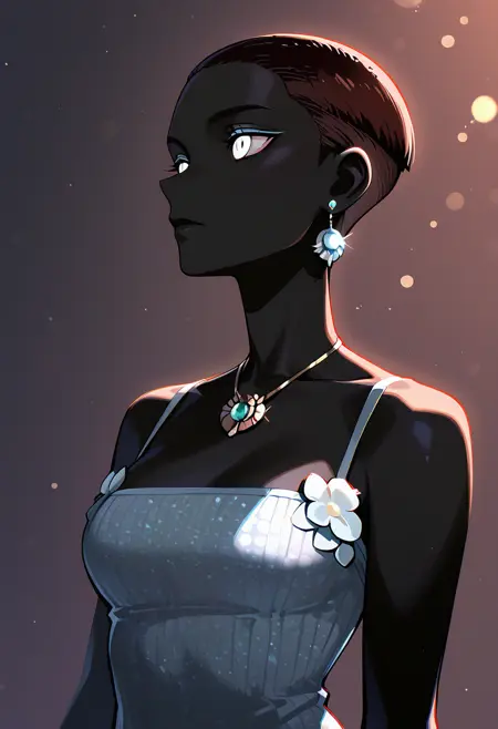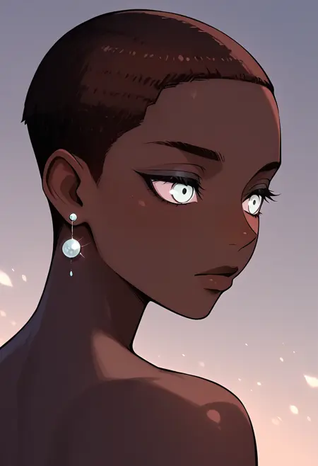 触发词: bianca barclay, 1girl, 非常深的肤色, 棕色头发, 非常短的头发, 平头, 白色眼睛, 耳环, 项链