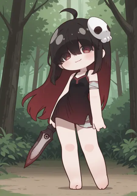 maison-tc,黑发,红发,呆毛,绷带手臂,绷带腿部,裸露肩膀,赤脚,黑色连衣裙,头骨发饰,头上戴面具,渐变发色,多色头发,极长发,头发遮住眼睛,眼睛透过头发可见,
