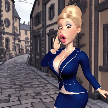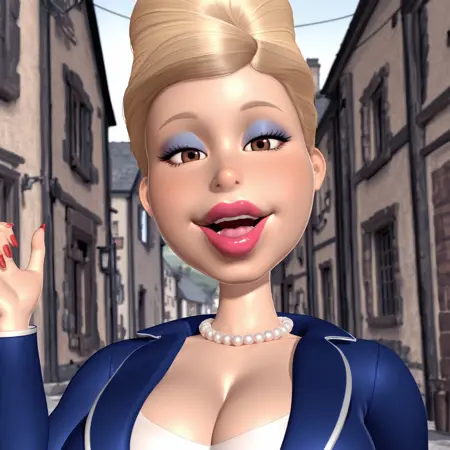toniturnersb, busty mature blonde female, brown eyes, thick lips with lipstick, makeup, pearl necklace, blue dress suit, white undershirt, cleavage, red nails, short blue pencil skirt, blue highheels