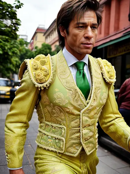 This lora produces bullfighting costumes. It's kind of rough. Use at full strength. Use the keyword tr4j3, and combinations of colors and metal. For example, "salmon pink and gold" or "black and silver" along with "traje de luces". The first version works well, but tends to want to show a behind view. Future versions will correct this. Enjoy!