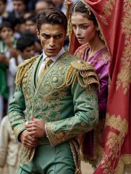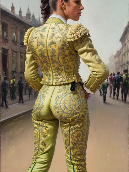 这个 LoRA 生成斗牛士服装,效果略显粗糙。请以全强度使用,搭配关键词 tr4j3 以及颜色和金属的组合,例如 “鲑鱼粉与金色” 或 “黑色与银色” 并结合 “traje de luces”。第一个版本效果不错,但倾向于显示背面视角,后续版本将修正此问题。尽情使用吧!