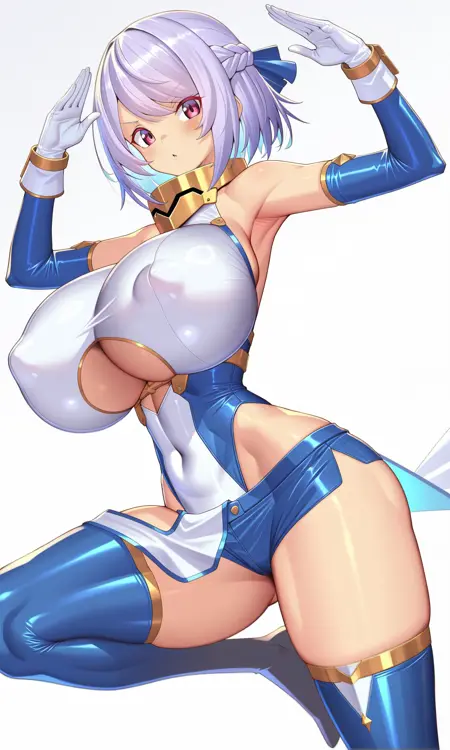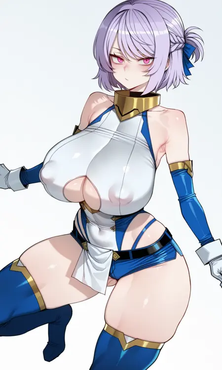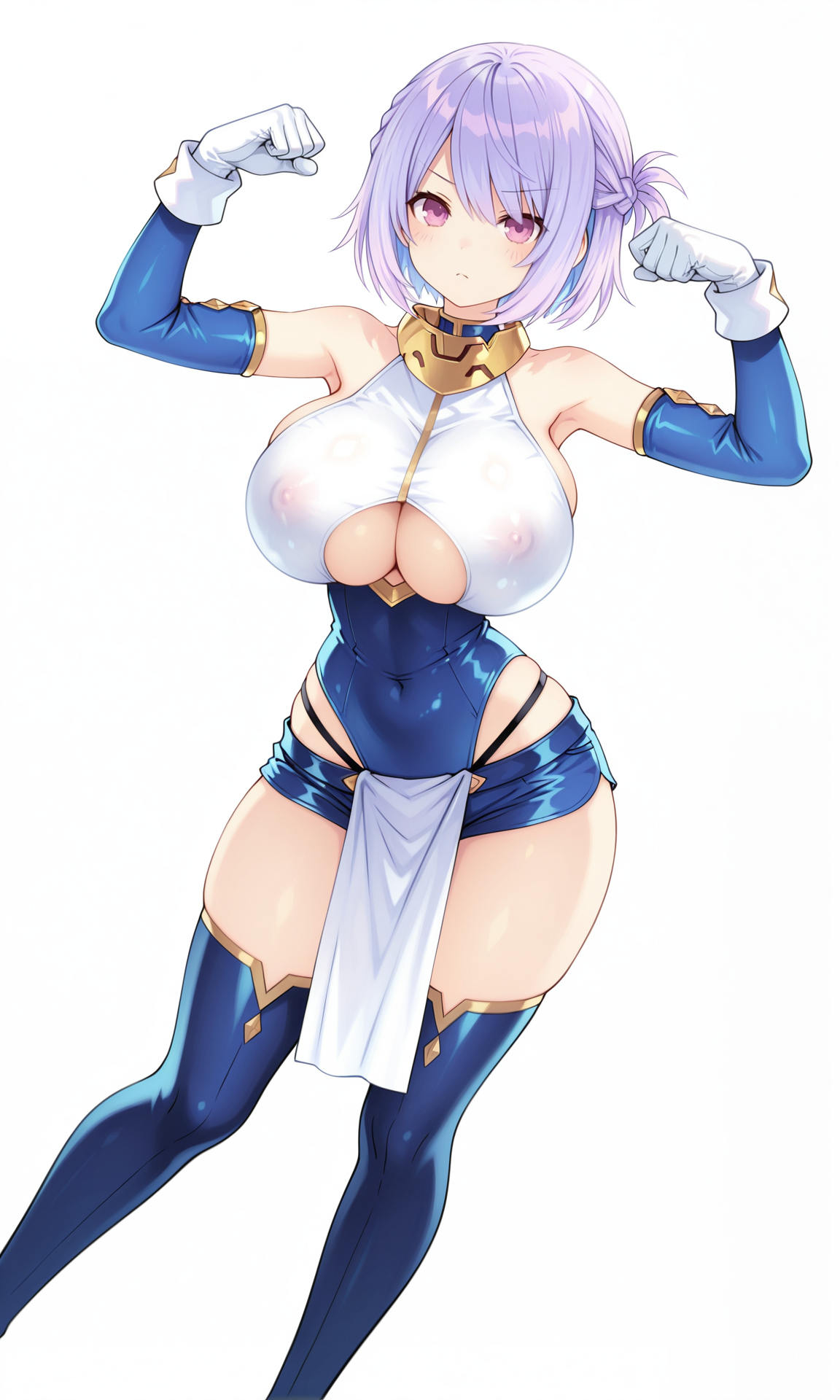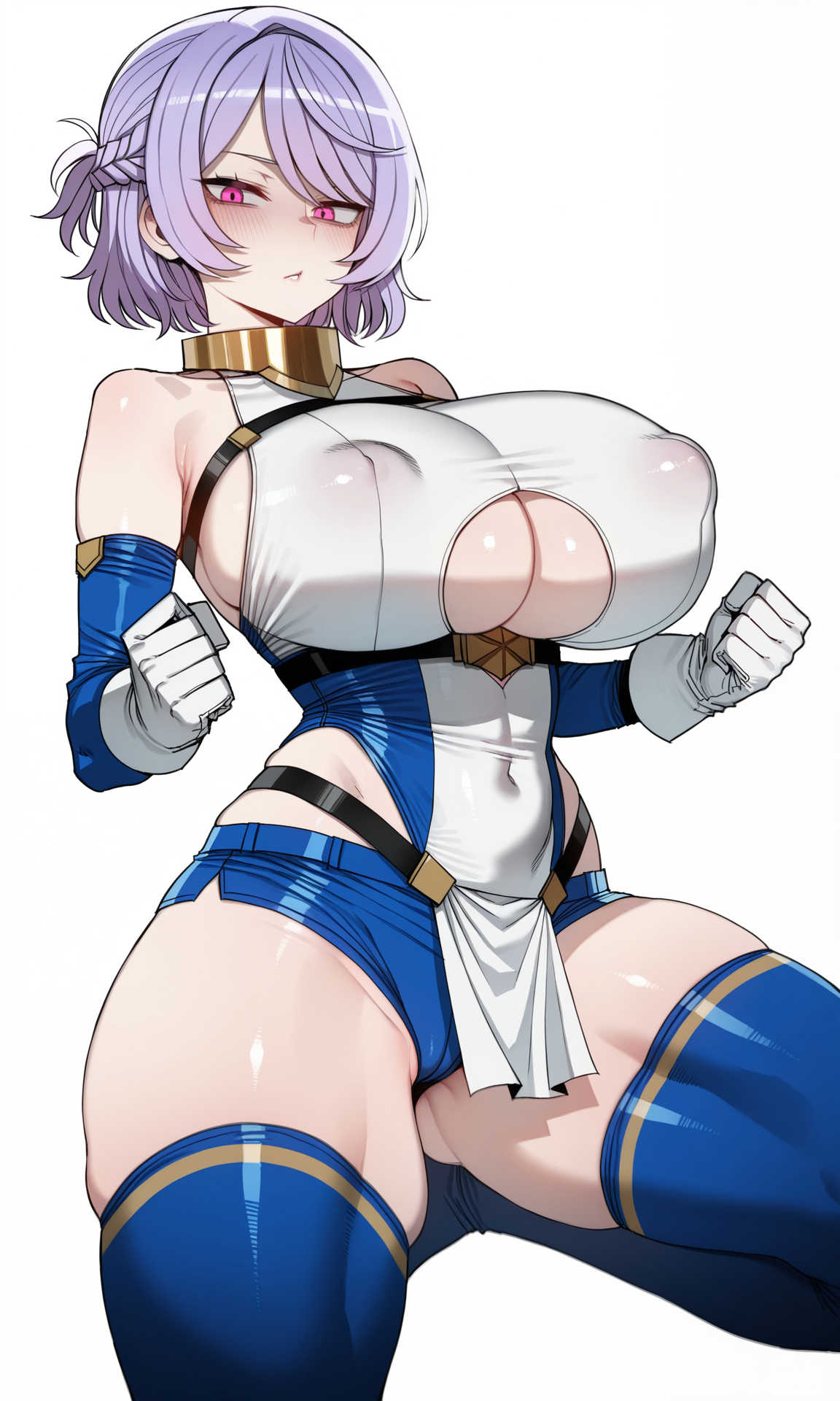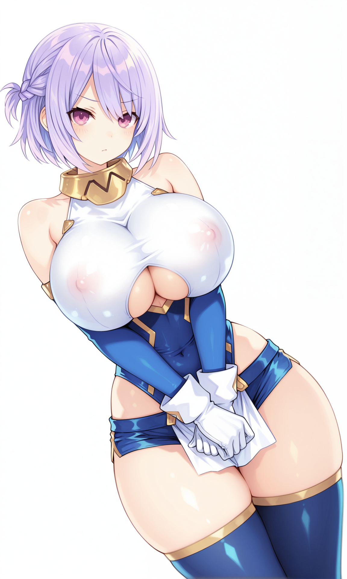 gold gorget,bare_shoulders, detached_sleeves,tight_clothes, blue_sleeves,white breastplate, gloves, white gloves,white_wristband, underboob cutout,blue_leotard,highleg_leotard,white pelvic curtain, blue_shorts,micro_shorts,