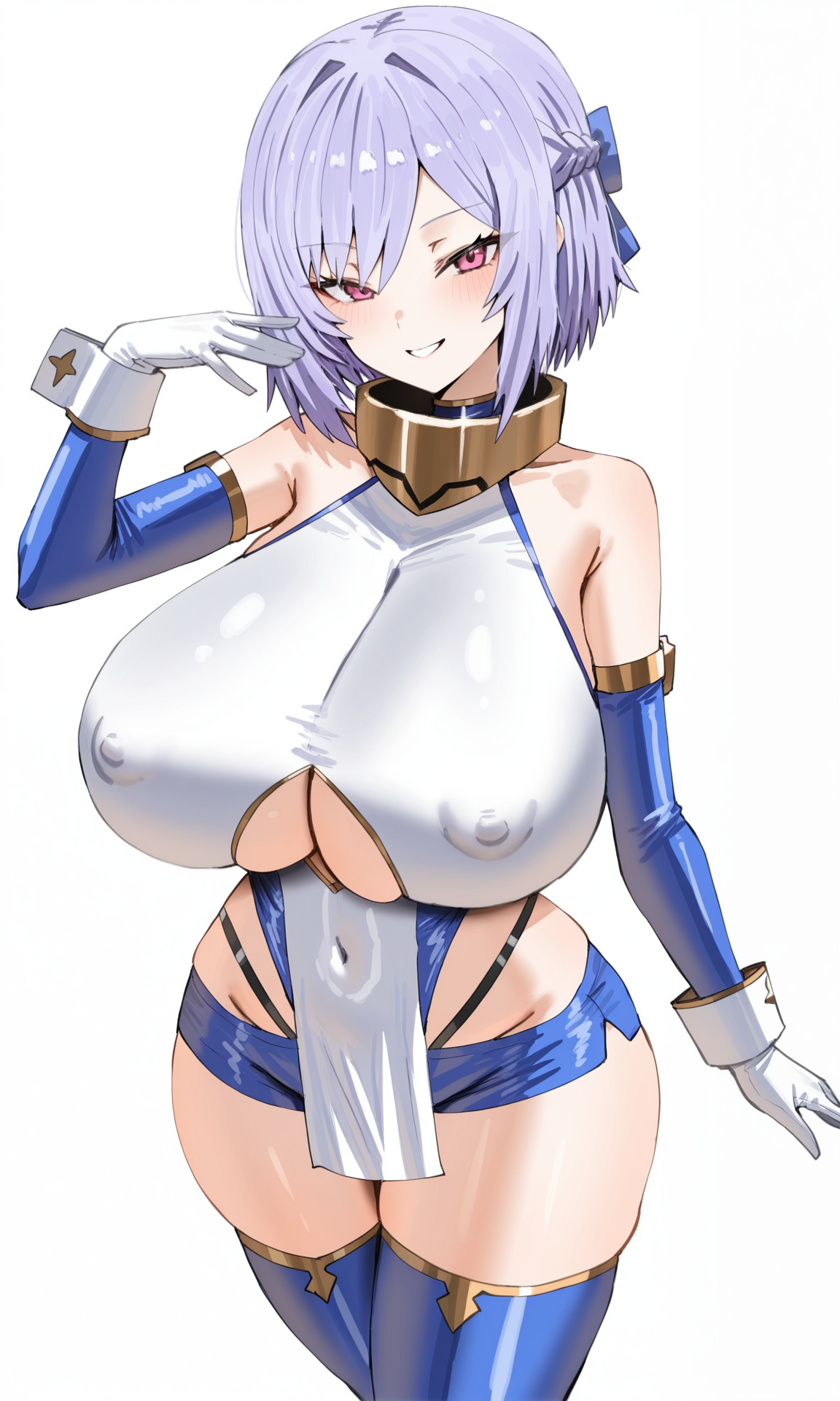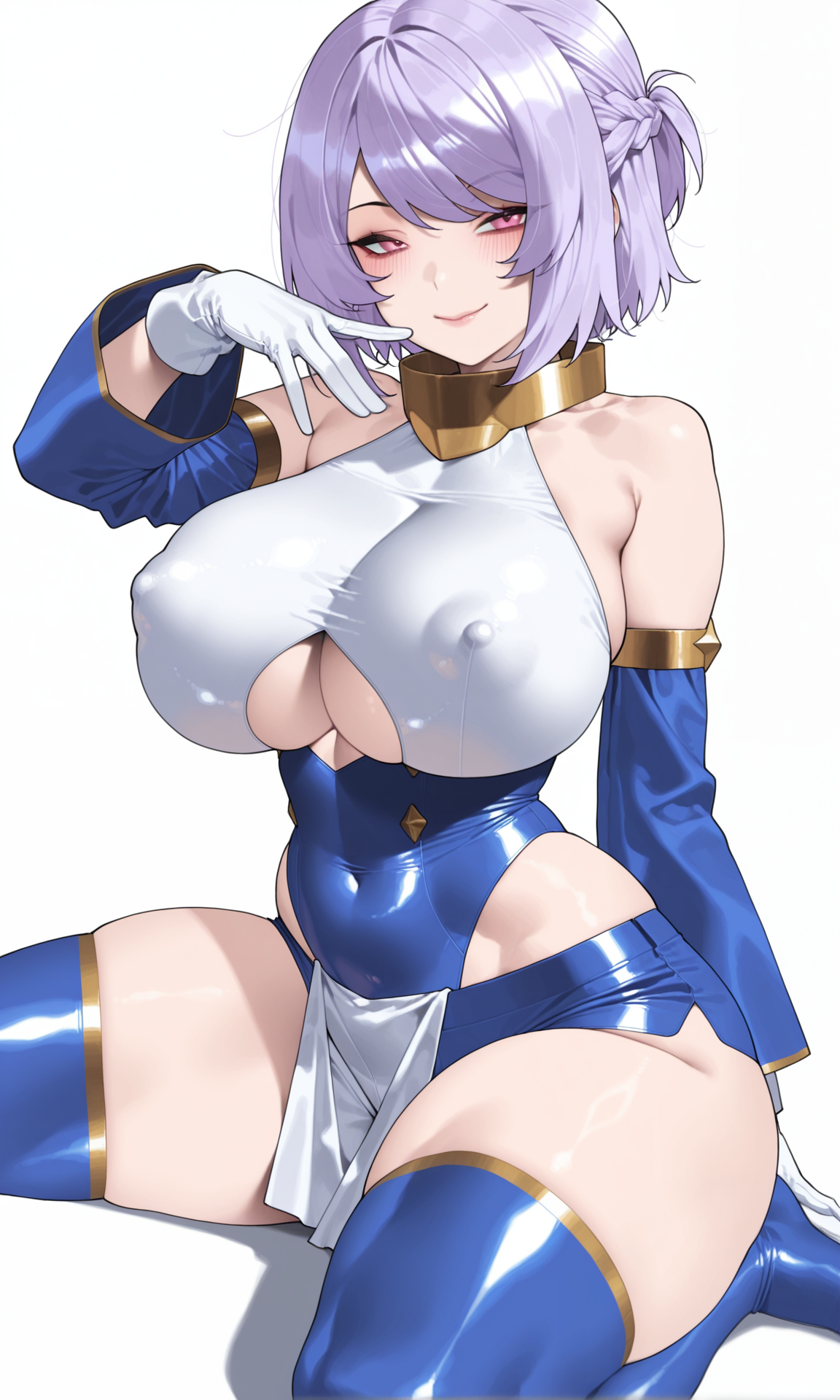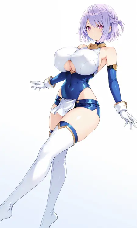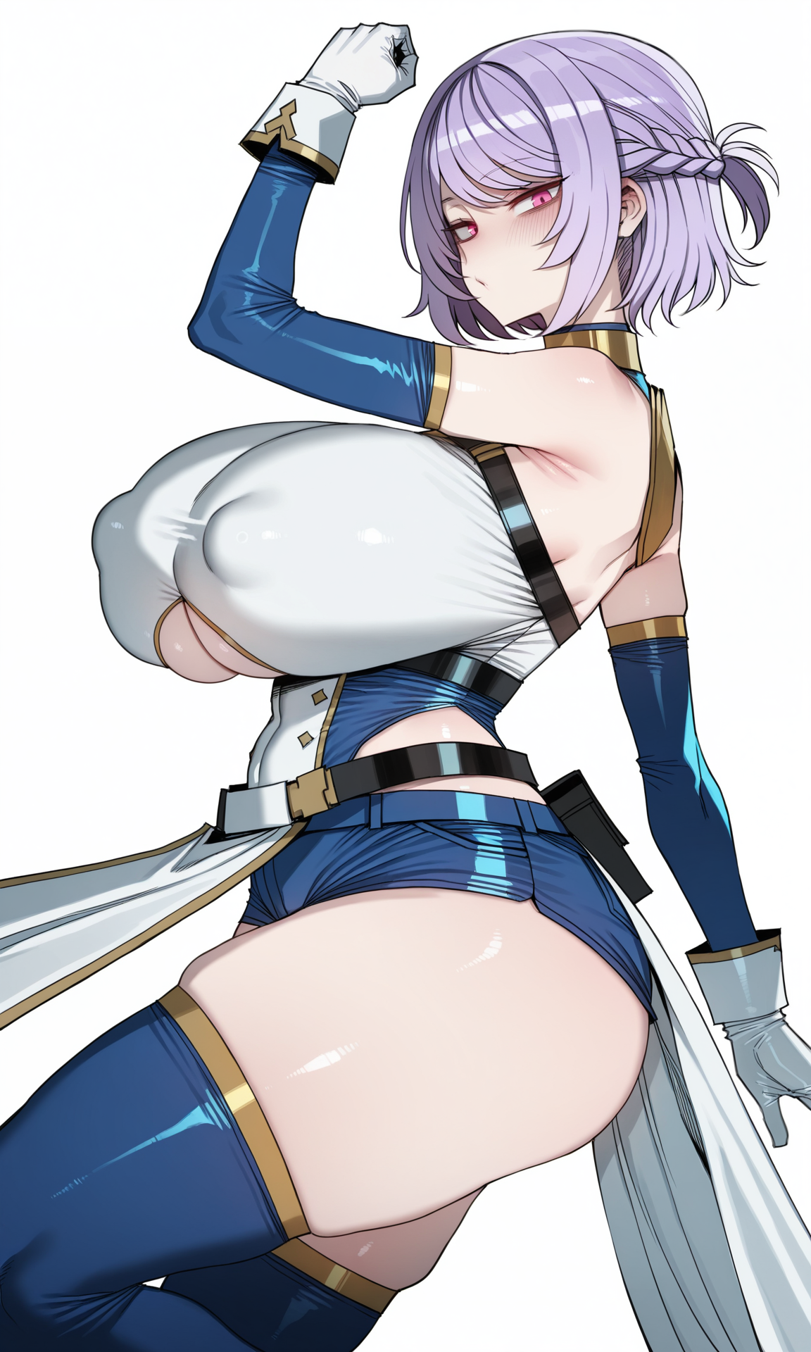 gold gorget,bare_shoulders, detached_sleeves,tight_clothes, blue_sleeves,white breastplate, gloves, white gloves,white_wristband, underboob cutout,blue_leotard,highleg_leotard,white pelvic curtain, blue_shorts,micro_shorts,