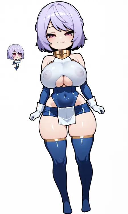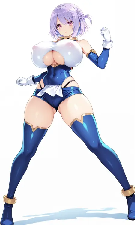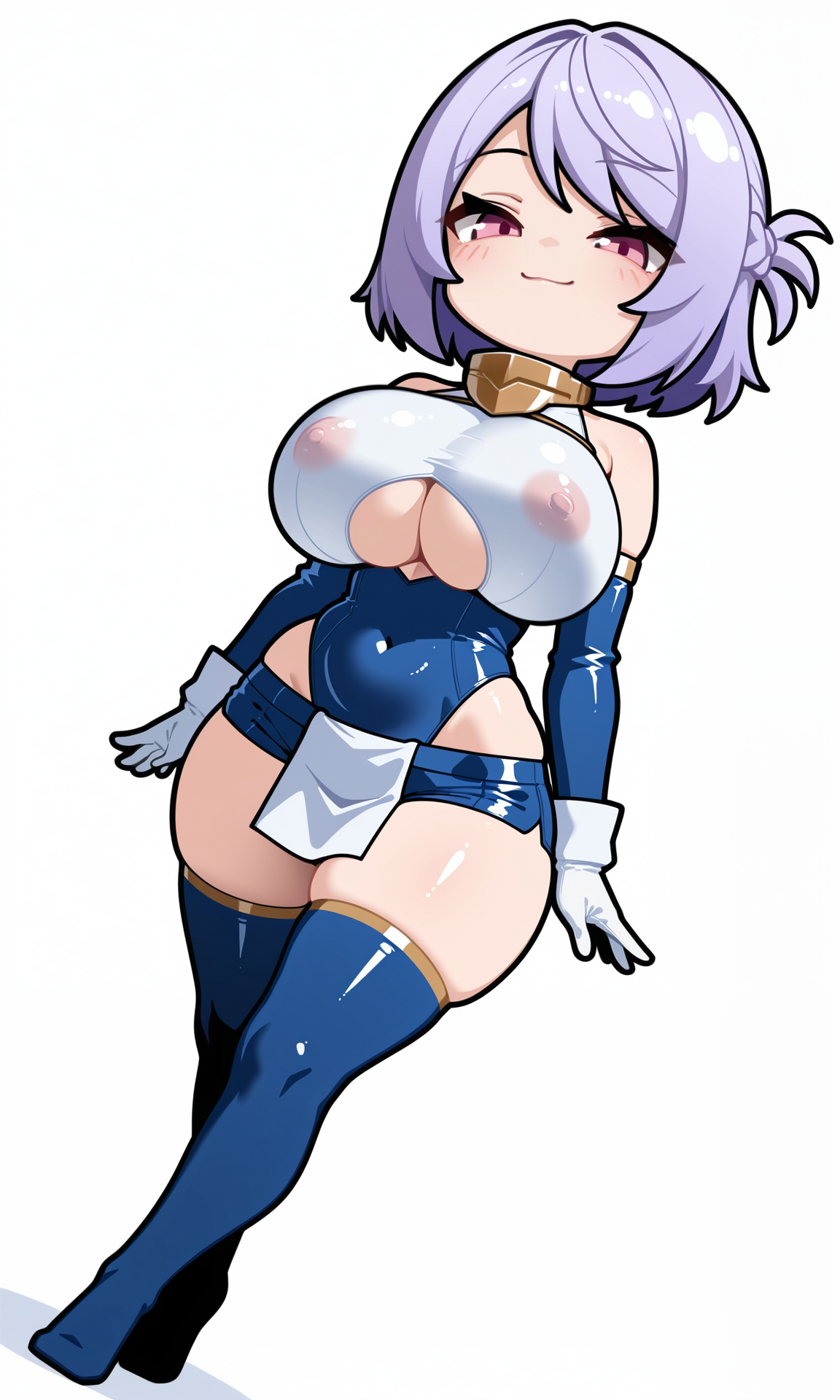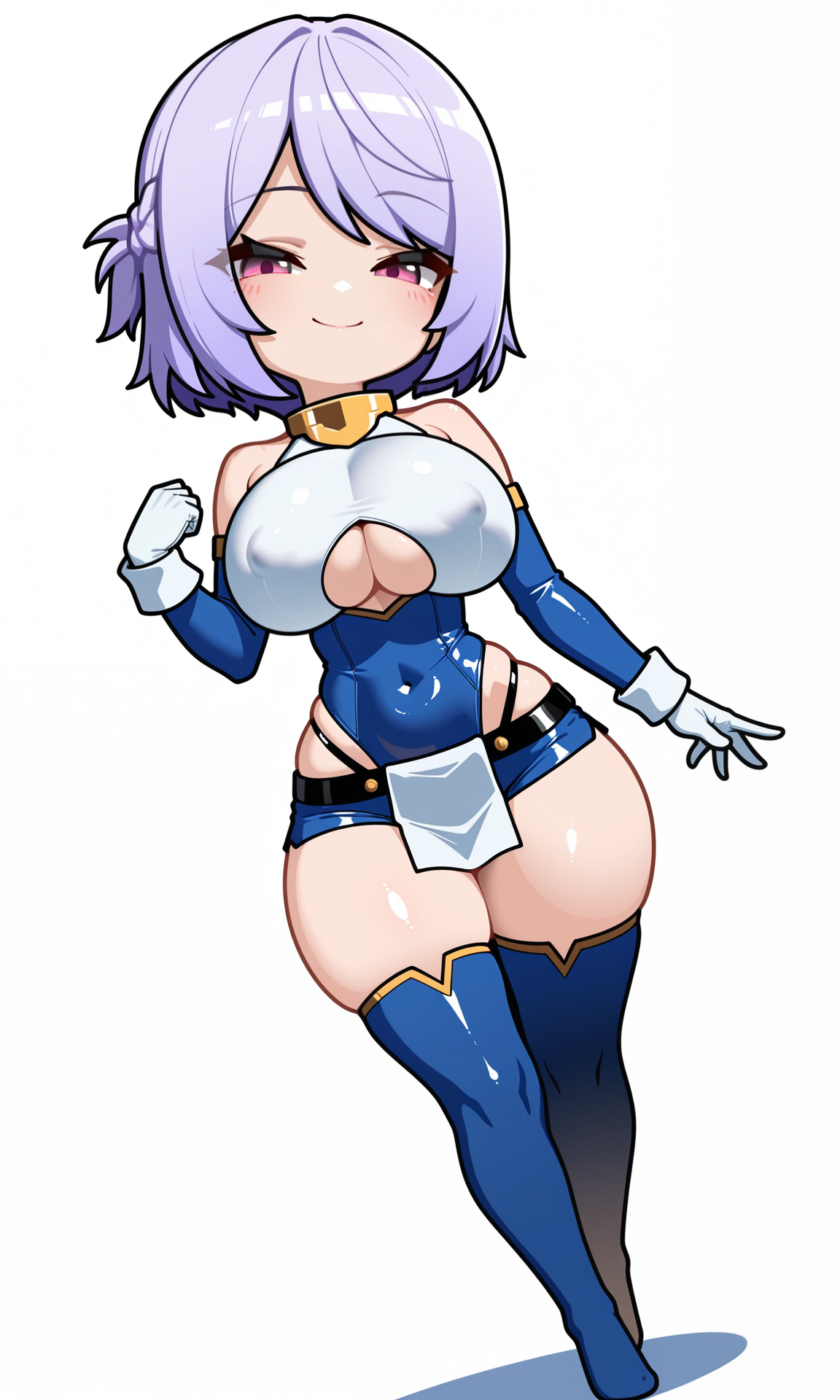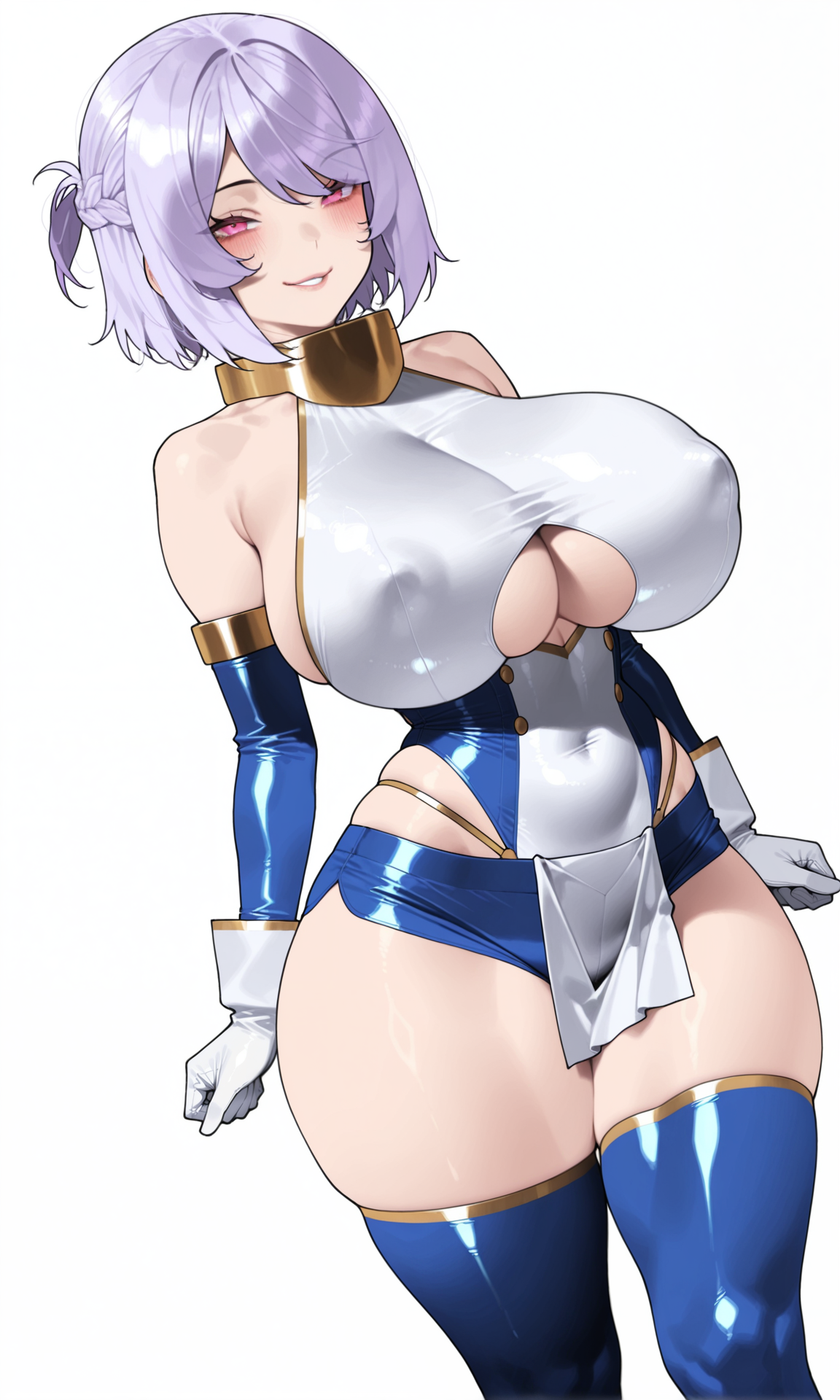 gold gorget,bare_shoulders, detached_sleeves,tight_clothes, blue_sleeves,white breastplate, gloves, white gloves,white_wristband, underboob cutout,blue_leotard,highleg_leotard,white pelvic curtain, blue_shorts,micro_shorts,
