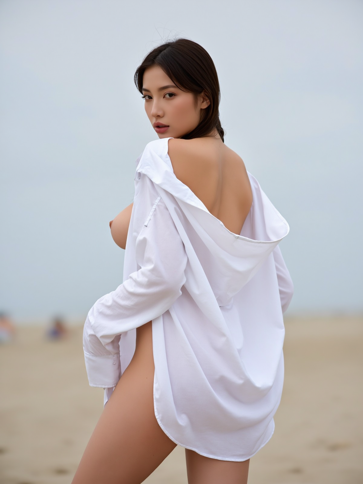 触发词:fluxmanshirt, 男子白色长袖衬衫, 1girl, 乳房, 单人, 乳头, 写实, 超写实, 长发, 大乳房, 户外, 海滩, 白天, 衬衫, 黑发, 模糊, 模糊背景, 透视, 站立, 赤裸上衣, 照片背景, 沙漠, 无胸罩, 沙子, 一只乳房露出, 衣服敞开, 深色皮肤女性, 袖子超过手腕, 宽大衬衫, 嘴唇, 遮挡裆部
