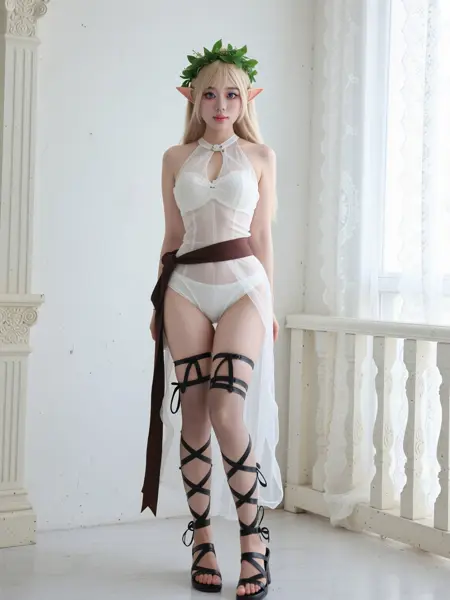 エルフの特徴を持つキャラクターで、金色の長い髪と尖った耳を持ち、頭には緑の植物の冠をかぶっています。肌は白く滑らかで、背が高く均整のとれた体型で、豊かな胸元を備えています。白く半透明なハーネストップを着用し、背中の中央に広い濃茶色の装飾リボンが腰まで垂れ下がっています。下部にはズボンのデザインはなく、同じタイプのリボンが腰と太ももの上部を巻きつけて装飾的なスリット構造を形成し、脚を露出させています。黒いグラディエーターサンダルを履いており、足首からふくらはぎの前面まで、複数層の交差した薄い革紐でしっかりと巻きつけられています。背景は純白のヨーロッパ風古典的な室内で、レースのカーテンと彫刻された手すりが整えられています。