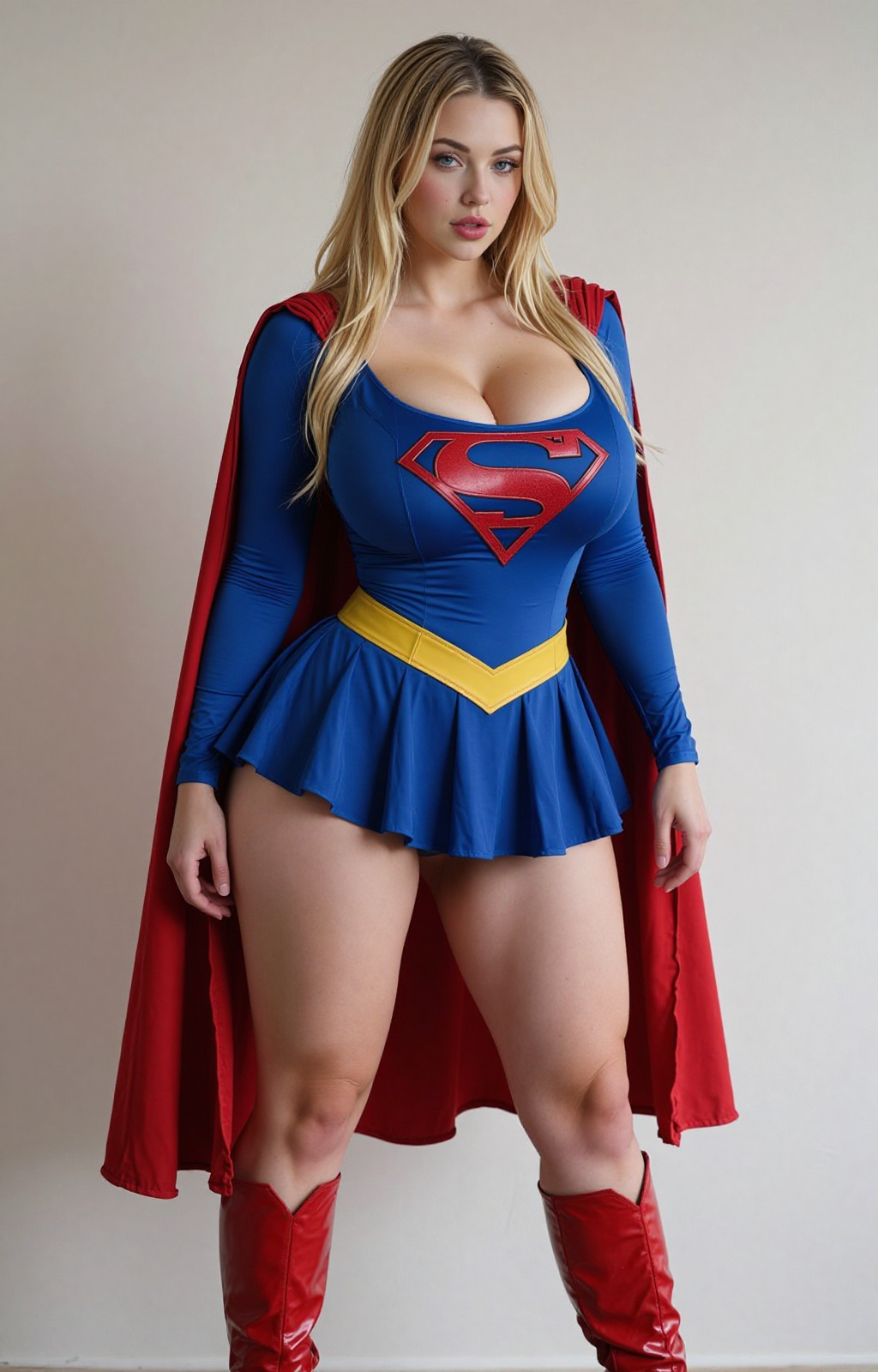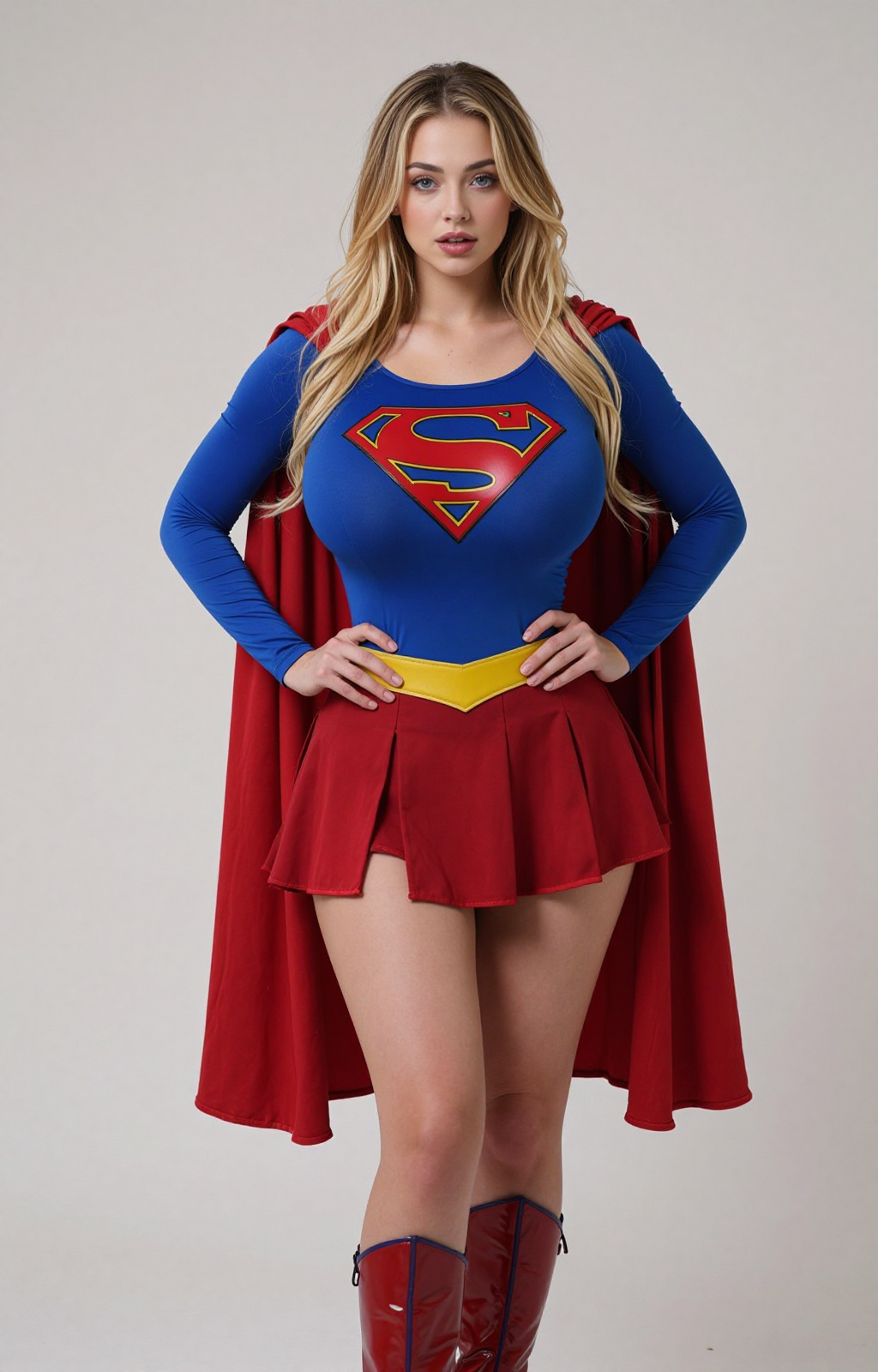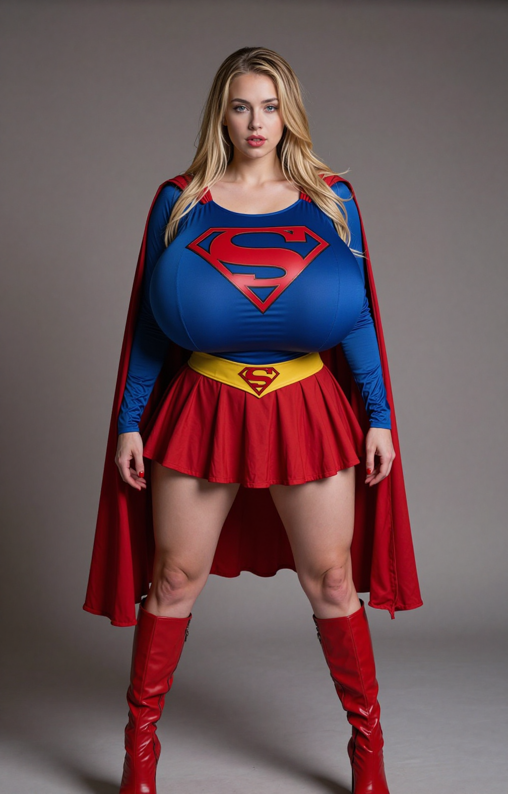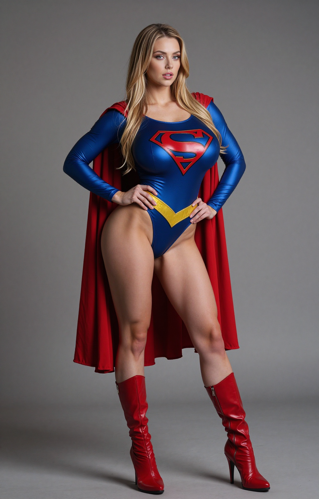 트리거: supergirl 옷차림, fluxsupergirl, 1girl, 가슴, 싱글, 망토, 금발, 파란 눈, 사실적, 부츠, 빨간 망토, 긴 머리, 거대한 가슴, 시청자 바라보기, 입술, 허벅지, 큰 가슴, 서 있음, 단순한 배경, 견갑골, 무릎 부츠, 빨간 신발, 회색 배경, 벌어진 입술