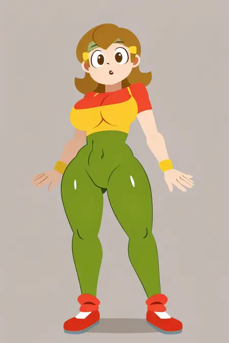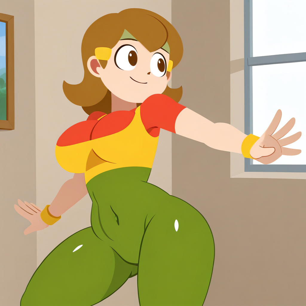 yellow wristbands, fully clothed, tight clothing, yellow bra, orange shirt, short sleeves, green leggings,