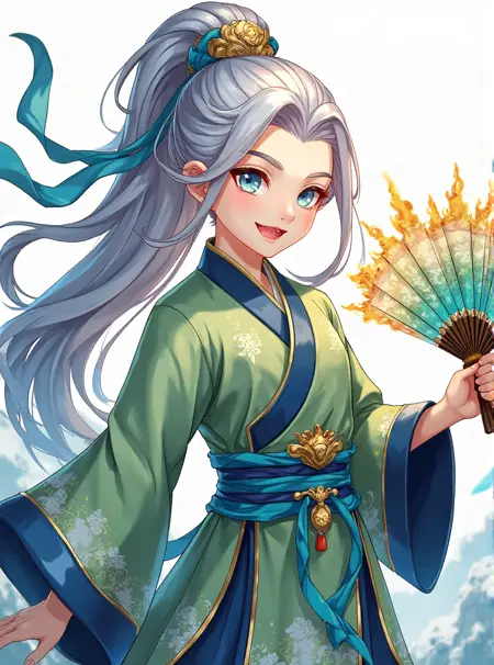 This is a Q-version immortal hero character, with silver and white long hair tied in a ponytail, dressed in a green and blue ancient costume, and holding a dazzling fan. The details of the clothing are exquisite, and the expression is lively, as if he is a mischievous little boy who is skilled in magic and has unique magical powers in the world of immortals.