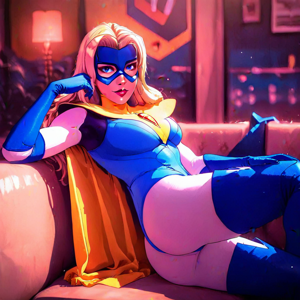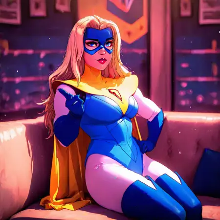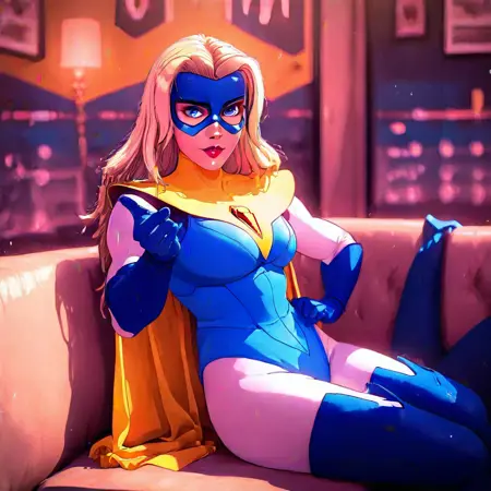 Blonde_Blazer, animification, superhero, blue eyes, blonde hair, long hair, medium breasts, lipstick, blue leotard, white bodysuit, yellow cape, blue mask, blue domino mask, blue eye mask, blue gloves, elbow gloves, thigh highs, blue thigh boots,