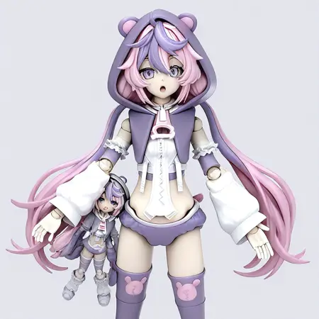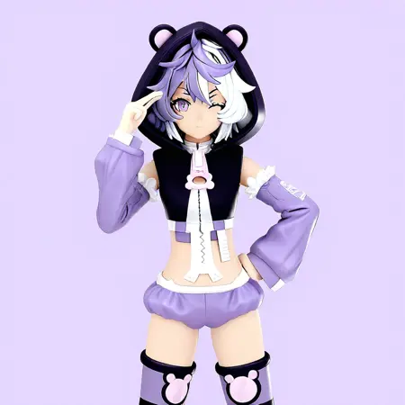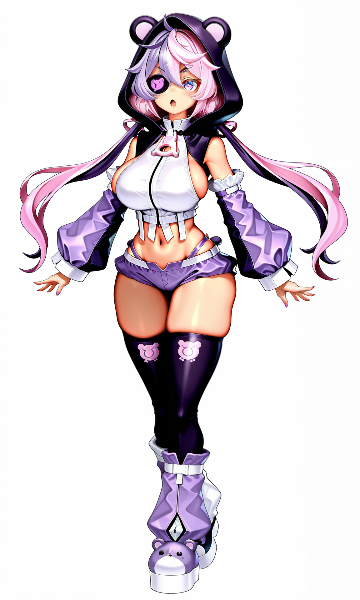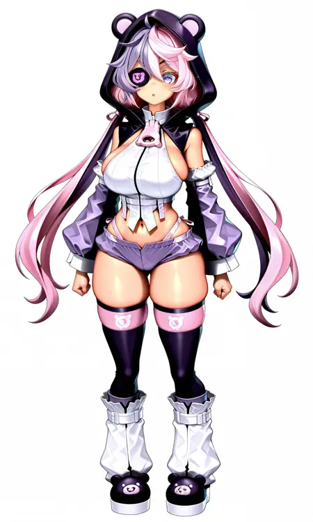タグ: 低めのツインテール、紫の目、長い髪、フード、太ももハイソックス、紫の髪、ピンクの髪、ツートーンヘア、アイパッチ、動物フード、クマフード、ショートショーツ、レッグウォーマー、取り外し可能な袖、ふわふわ袖、紫の袖,