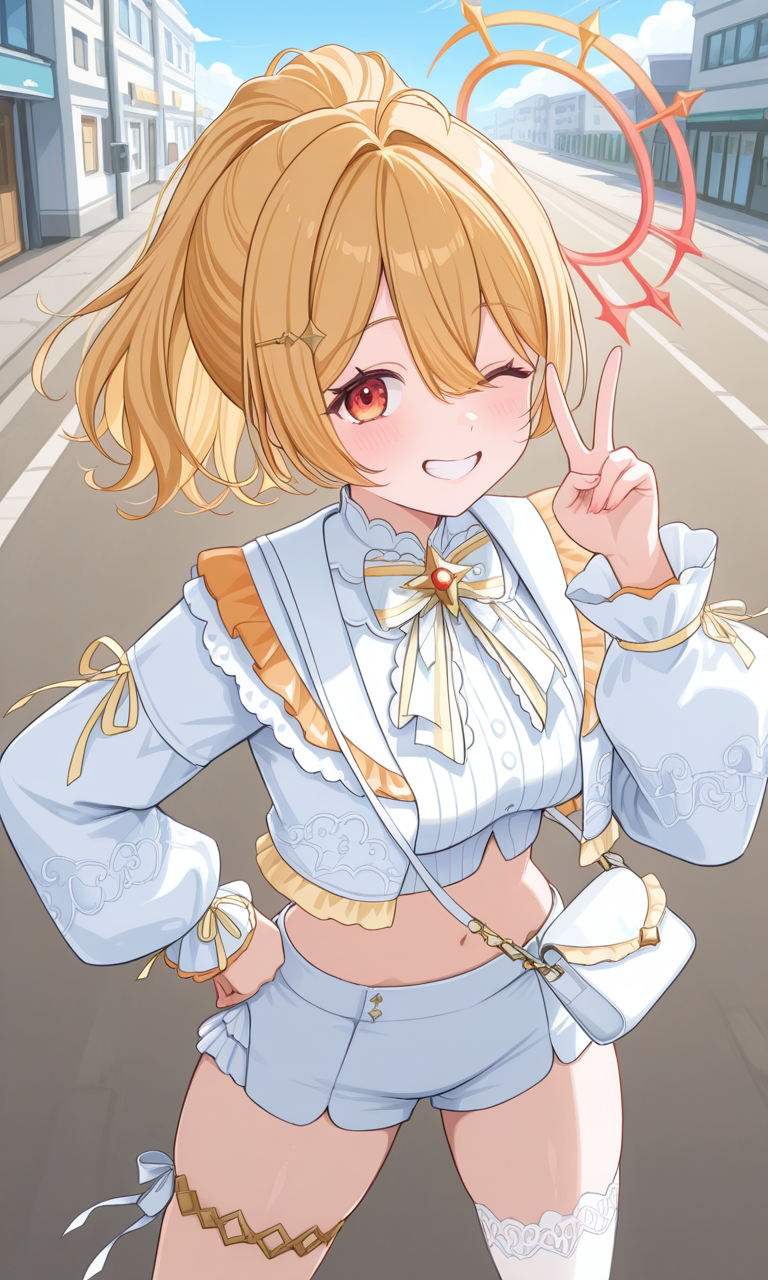 hinata mashu, mashu second, medium hair, ponytail, hairclip, halo, white crop top, frilled shirt collar, alt white bowtie, white jacket, shoulder bag, navel, white shorts, thigh strap, single thighhigh, white thighhighwhite jacket, shoulder bag을 제거하고sleeveless를 추가할 수 있습니다.
