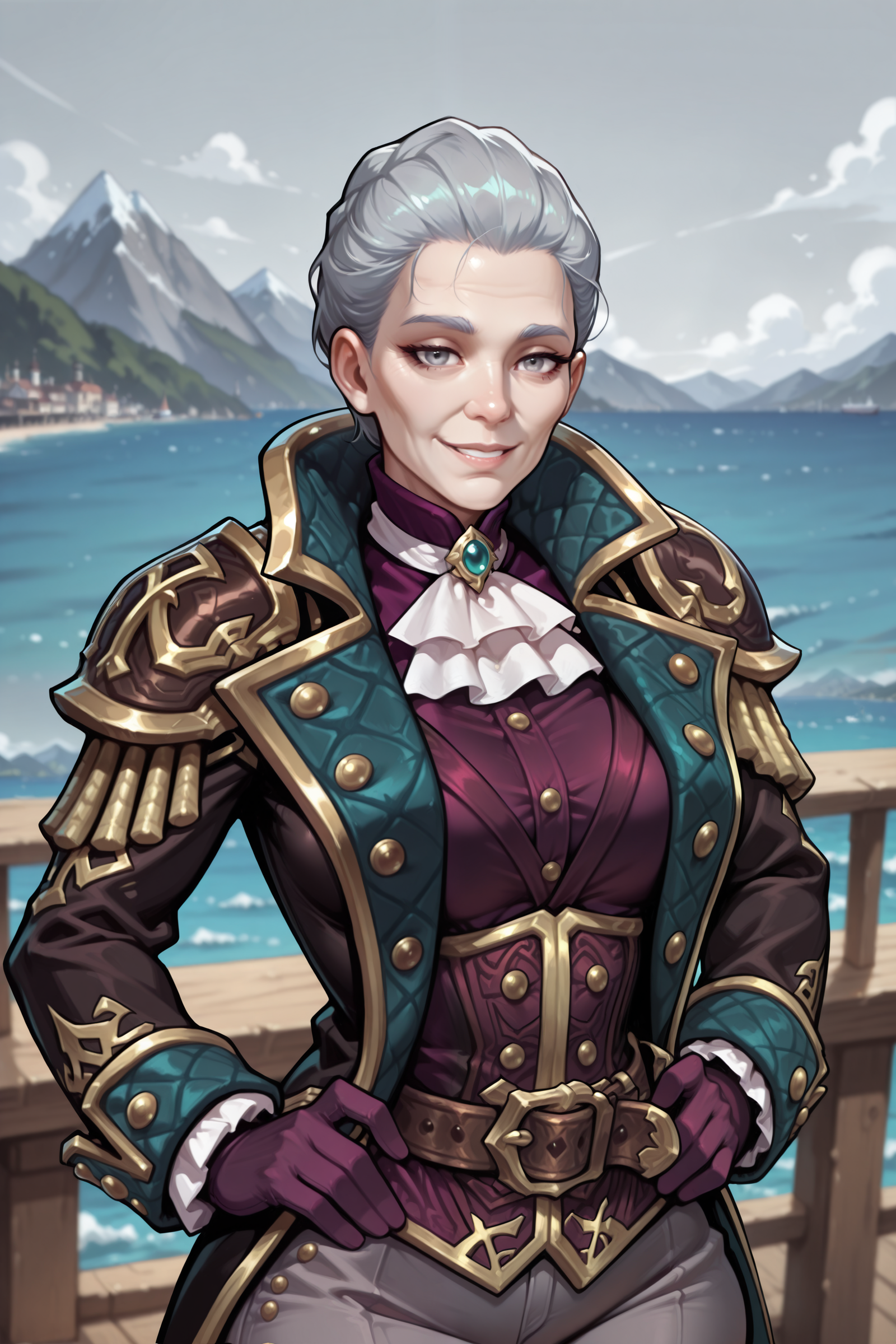 black collared overcoat, ascot, gold pauldrons, purple shirt, purple gloves, belt, grey pants, black boots, gold trim, gold buttons