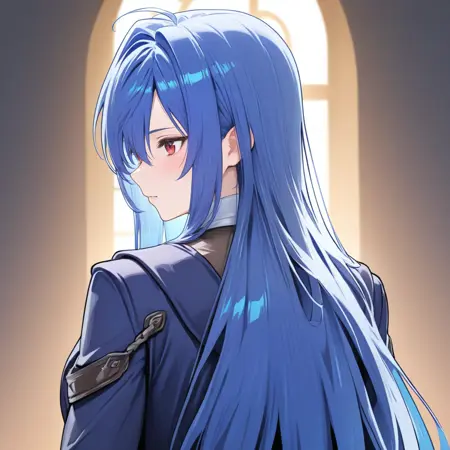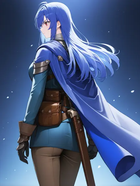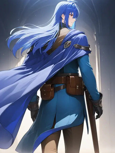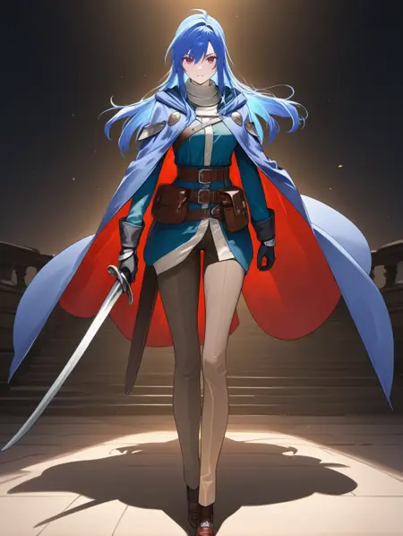 프롬프트 예시: deliasu, 파란 머리, 긴 머리, 붉은 눈, 파란 망토, 벨트 주머니, 긴 소매, 검은 장갑, 바지, 신발, 칼집, 진지함, 판타지,