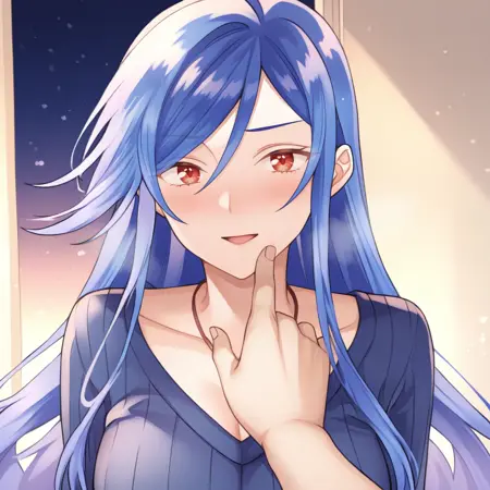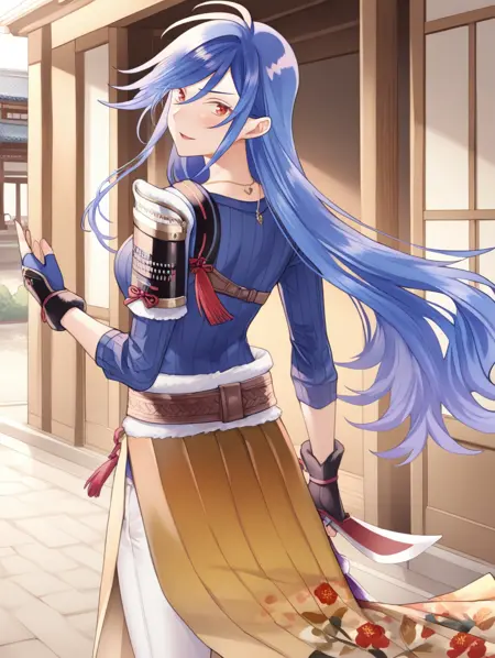 提示示例:sakuragumo,蓝色头发,长发,红眼睛,蓝色毛衣,项链,肩甲,腰间和服外套,腰带,单只露指手套,白色裤子,靴子,东亚建筑,