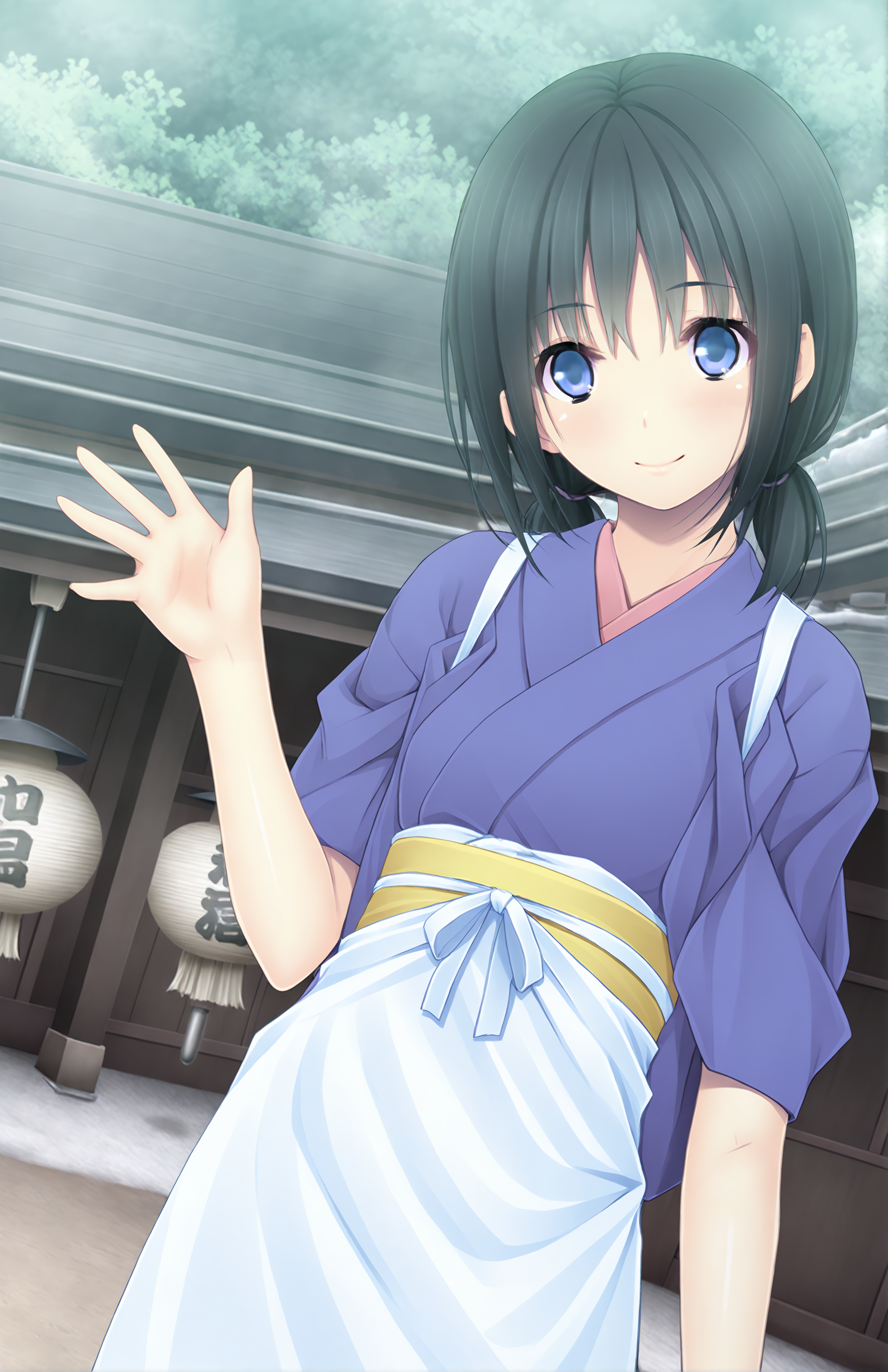 NondaMako, black hair, twintails, blue eyes, japanese clothes, kimono, apron, low twintails, tasuki