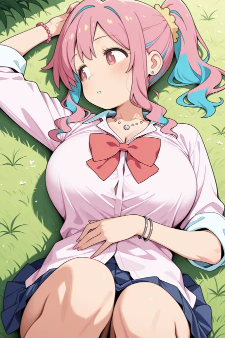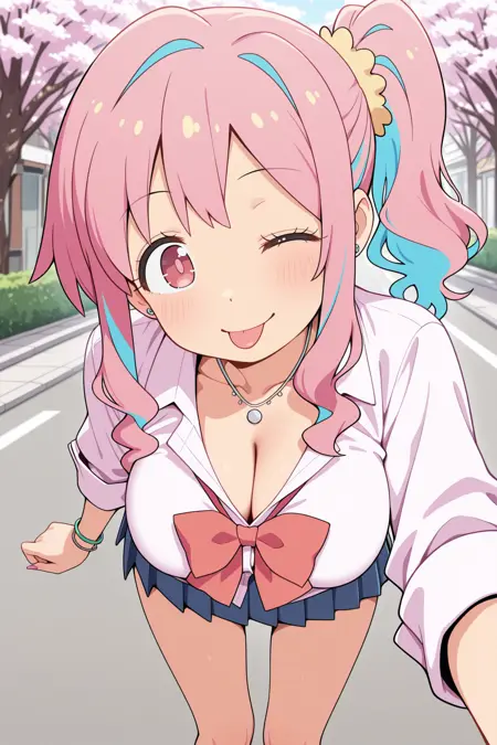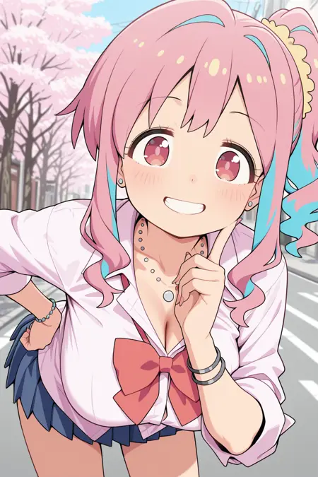 ネックレス, 袖をまくった, カラー付きシャツ, ブレスレット, 赤いボウタイ, プリーツスカート, 青いスカート, ミニスカート, ギャル,