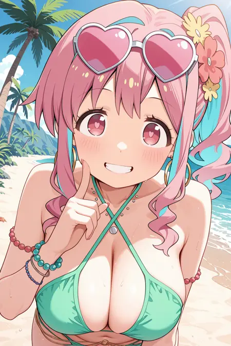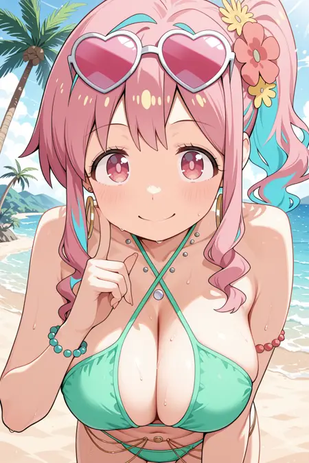 ネックレス, 髪飾り, ハート型メガネ, メガネを頭に, ループイヤリング, 緑のビキニ, クロスハーネス, 腹飾り, ビーズアームレット, ビーズブレスレット